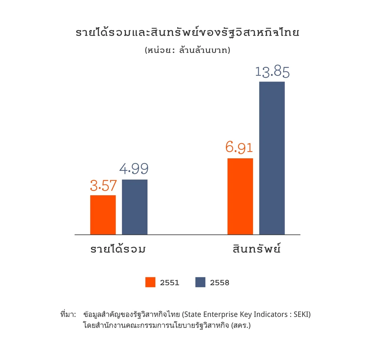 ในด้านสินทรัพย์นั้น มูลค่าสินทรัพย์ที่รัฐวิสาหกิจเป็นเจ้าของหรือบริหารนั้นเพิ่มขึ้นเท่าตัวจาก 7 ล้านล้านบาทในปี 2551 เป็นกว่า 14 ล้านล้านบาทในปี 2558 สินทรัพย์ของรัฐวิสาหกิจมีความสำคัญมหาศาลต่อระบบเศรษฐกิจของประเทศ โดยเฉพาะระบบคมนาคมขนส่ง ทั้งสนามบิน ท่าเรือ ทางพิเศษ ทางรถไฟ รวมไปถึงระบบโทรคมนาคม เช่น เสาโทรคมนาคม การบริหารสินทรัพย์เหล่านี้ให้มีประสิทธิภาพจึงเป็นโจทย์ใหญ่ในการพัฒนาขีดความสามารถของประเทศ