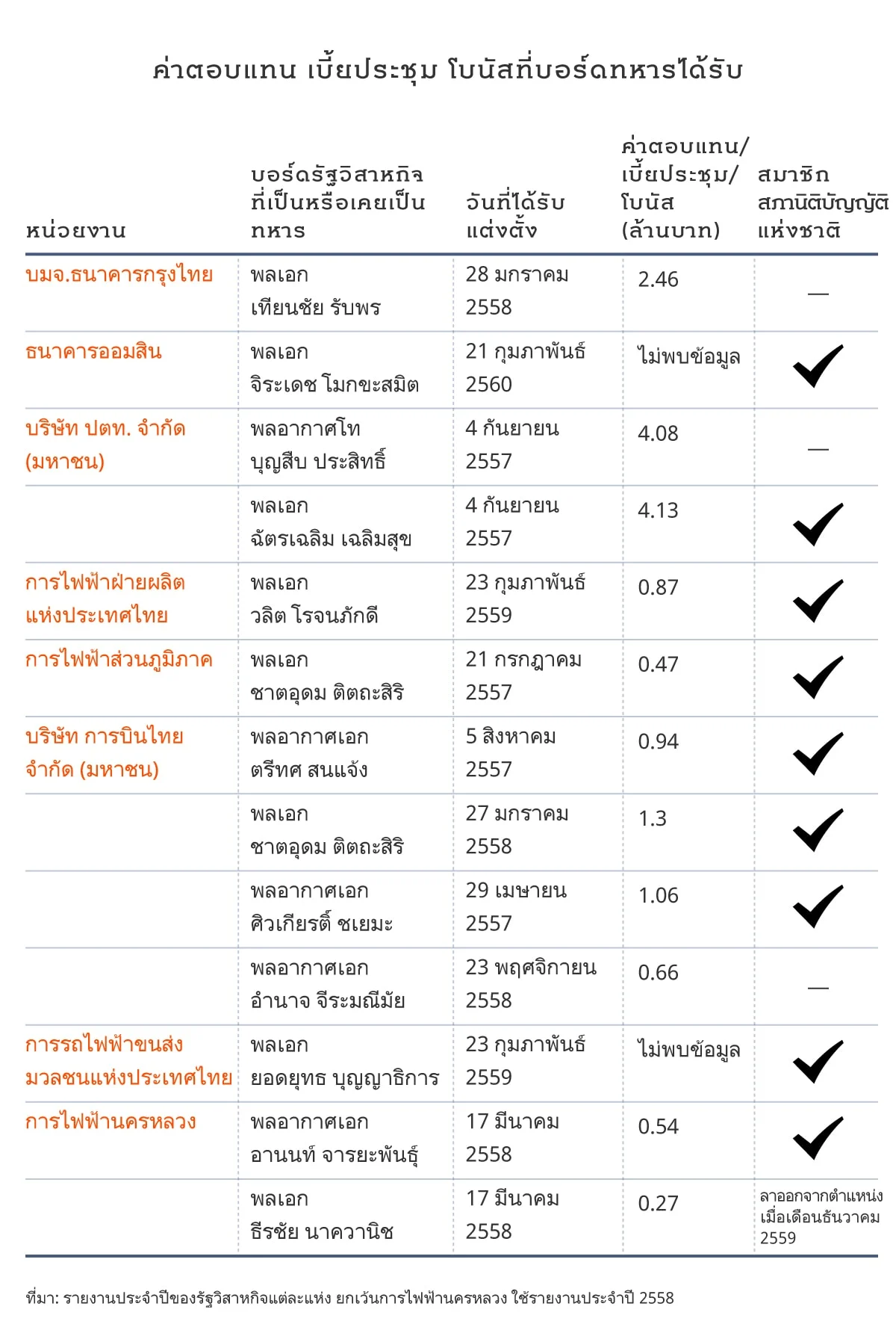 นอกจากนี้ แม้ว่าพลเอก ประยุทธ์ จันทร์โอชา จะชี้แจงว่า การแต่งตั้งให้ผู้ที่เป็นหรือเคยเป็นทหารเข้ามานั่งเก้าอี้บอร์ดรัฐวิสาหกิจนั้นเป็นการ “นั่งสังเกตการณ์ ไม่ใช่ไปนั่งยกมือแสดงความคิดเห็น” แต่จากข้อมูลในรายงานประจำปีของรัฐวิสาหกิจต่างๆ พบว่า รัฐวิสาหกิจต้องจ่ายค่านั่งสังเกตการณ์ตามนิยามของนายกรัฐมนตรีให้แก่บอร์ดรัฐวิสาหกิจตามตัวอย่างข้างต้น ทั้งค่าตอบแทน เบี้ยประชุม และโบนัส เฉลี่ยประมาณ 1.5 ล้านบาทต่อตำแหน่งต่อปี