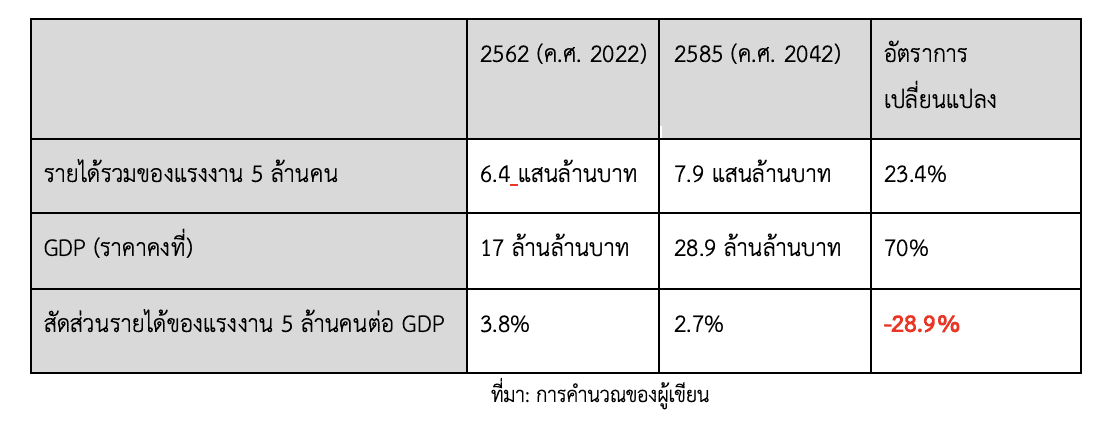 ในปัจจุบัน ประเทศไทยมีแรงงานในระบบประกันสังคมที่ได้รับค่าจ้างขั้นต่ำ ประมาณ 5 ล้านคน สมมติค่าจ้างขั้นต่ำเท่ากับ 353 บาท รายได้ต่อปีของแรงงานกลุ่มนี้ตกประมาณ 7 แสนล้านบาท (5 ล้านคน x 365 วัน x 353 บาท) ซึ่งคิดเป็น 3.8% ของ GDP ในปี 2562 หากประเทศไทยใช้สูตรปรับขึ้นค่าจ้างขั้นต่ำเช่นนี้ต่อไปเรื่อยๆ ในขณะเดียวกันผลิตภาพแรงงานก็เพิ่มขึ้น 70% ในช่วง 20 ปี อ้างอิงตามข้อมูลในอดีต สัดส่วนของรายได้ของแรงงาน 5 ล้านคนนี้จะลดลงเหลือ 2.7% ของผลผลิตมวลรวมในปี 2585 นั่นหมายความว่าสัดส่วนรายได้ของแรงงานกลุ่มนี้ต่อ GDP จะลดลงประมาณ 30% ซึ่งสะท้อนถึงความเหลื่อมล้ำที่เพิ่มสูงขึ้น ดังแสดงในตารางที่ 4