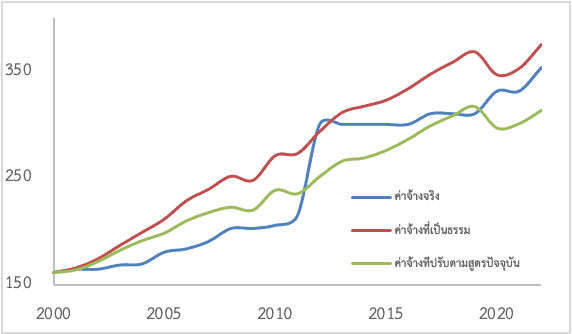 เพื่อให้เห็นภาพที่ชัดขึ้น ผู้เขียนได้จำลองการปรับขึ้นค่าจ้างขั้นต่ำของกรุงเทพฯ (รูปที่ 1) โดยใช้ปี 2543 เป็นจุดเริ่มต้น หากใช้สูตรที่เป็นธรรม ค่าจ้างขั้นต่ำของกรุงเทพฯ จะปรับขึ้นดังเส้นสีแดง แต่หากใช้สูตรปัจจุบันจะปรับขึ้นดังเส้นสีเขียว จะเห็นว่า การปรับขึ้นของค่าจ้างโดยใช้สูตรปัจจุบันของไทยต่ำกว่าสูตรที่เป็นธรรมโดยตลอด และต่ำกว่าค่าจ้างขั้นต่ำจริงนับตั้งแต่ปี 2555 ซึ่งเป็นสมัยที่รัฐบาลยิ่งลักษณ์ที่ออกนโยบายปรับค่าแรงขั้นต่ำอย่างก้าวกระโดดมาเป็น300 บาท (ยกเว้นปี 2562 ที่ค่าจ้างจริงต่ำความค่าจ้างที่ปรับตามสูตรปัจจุบัน)
