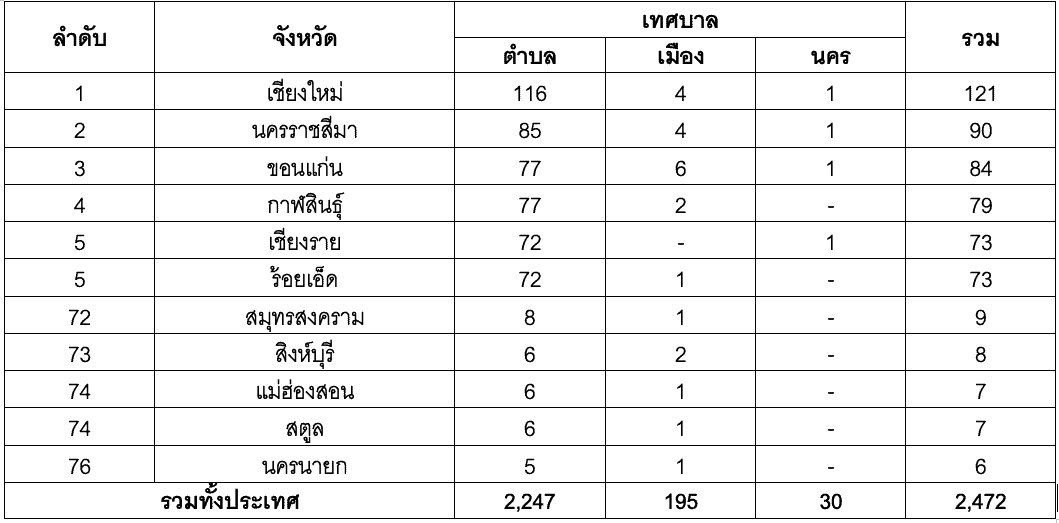 จังหวัดที่มีจำนวนเทศบาลมากที่สุด 5 อันดับแรก และ 5 อันดับสุดท้ายของประเทศ[5]