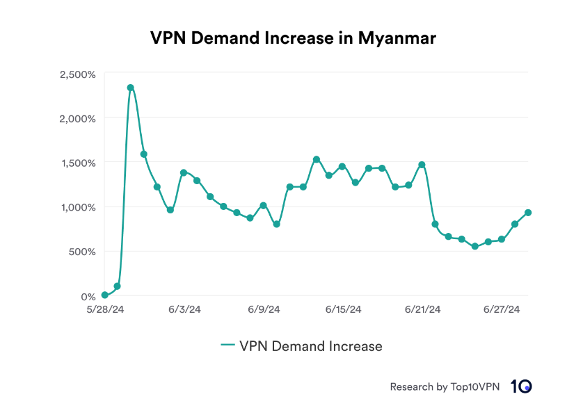 กราฟแสดงความต้องการใช้ VPN ในพม่าหลังกระทรวงคมนาคมและการสื่อสารพม่าสั่งระงับบริการ VPN เมื่อปลายเดือนพฤษภาคม 2024 | ที่มา: Top10VPN