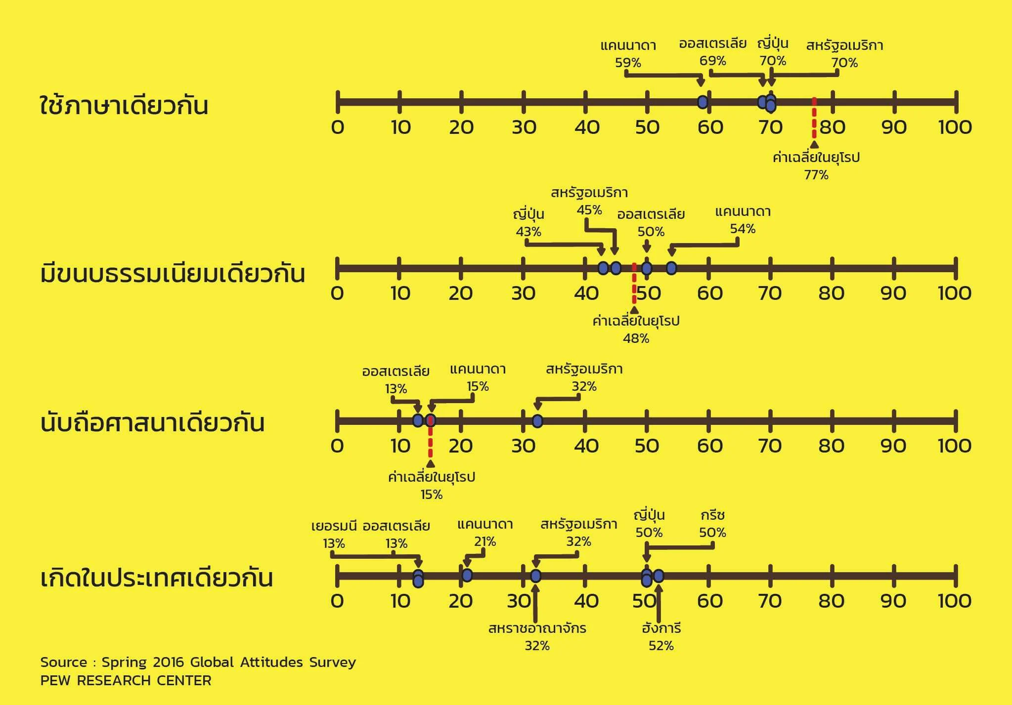 Pew Research Centre หน่วยงาน Think Tank จากสหรัฐ ได้ทำการสำรวจคนจาก 14 ชาติ จำนวน 14,514 ตัวอย่าง โดยวัดความเป็นชาติเดียวกัน (national identity) ว่าเราจะวัดกันที่ตรงไหน ซึ่งหลักเกณฑ์ที่ทาง Pew Research กำหนดขึ้นมาวัดความเป็นชาติเดียวกันมีทั้ง ภาษาที่ใช้ ขนบธรรมเนียม (เช่น อาหารที่ทาน เสื้อผ้าที่สวมใส่ นิทานที่เล่าให้เด็กฟัง) การนับถือศาสนา ประเทศที่เกิด เป็นต้น