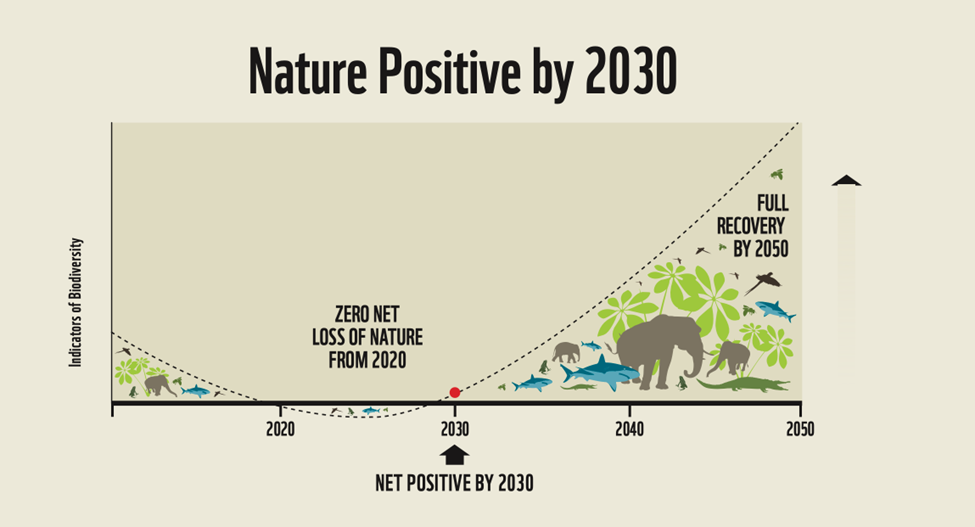 ในปี 2022 แนวคิด Nature Positive ได้รับการยอมรับในเวทีระดับโลกผ่านการประชุมสมัชชาภาคีอนุสัญญาว่าด้วยความหลากหลายทางชีวภาพ สมัยที่ 15 (COP15) ซึ่งบรรลุข้อตกลงกรอบงานว่าด้วยความหลากหลายทางชีวภาพของโลกฉบับใหม่ ดังนั้น Nature Positive จึงถูกกำหนดให้เป็นเป้าหมายระดับโลกที่มุ่ง “หยุดยั้งและฟื้นฟูการสูญเสียธรรมชาติภายในปี 2030 โดยใช้ปี 2020 เป็นฐาน และมุ่งให้เกิดการฟื้นฟูอย่างสมบูรณ์ภายในปี 2050” โดยกำหนดเป้าหมายเป็นสามช่วงเวลา ประกอบด้วย