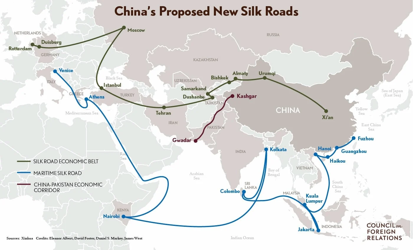 จีนได้นำเสนอยุทธศาสตร์เส้นทางสายไหมใหม่ในปี 2013 เมื่อประธานาธิบดี สี จิ้นผิง เดินทางไปเยือนมหาวิทยาลัยนาซาร์บาเยฟ กรุงอัสตานา คาซัคสถาน ในเดือนกันยายน 2013 เขาได้ประกาศข้อริเริ่ม “หนึ่งแถบหนึ่งเส้นทาง” (One Belt, One Road: OBOR) ซึ่งประกอบด้วย “แถบเศรษฐกิจเส้นทางสายไหม” (Silk Road Economic Belt) ผ่านเส้นทางทางบก และ “เส้นทางการค้าสายไหมทางทะเลในศตวรรษที่ 21” (21st Century Maritime Silk Road) เชื่อมโยงจีนเข้ากับมหาสมุทรอินเดีย อ่าวเปอร์เซีย และทะเลเมดิเตอร์เรเนียน โดยจะมีการสร้างโครงสร้างพื้นฐานต่างๆ ไม่ว่าจะเป็นเครือข่ายทางรถไฟความเร็วสูง ถนน ท่าเรือ และท่อส่งก๊าซและน้ำมัน