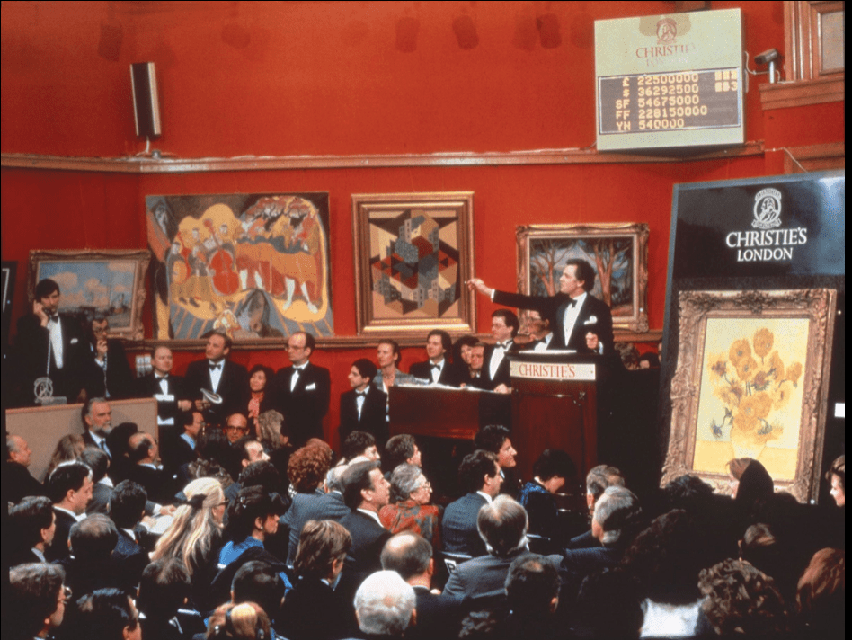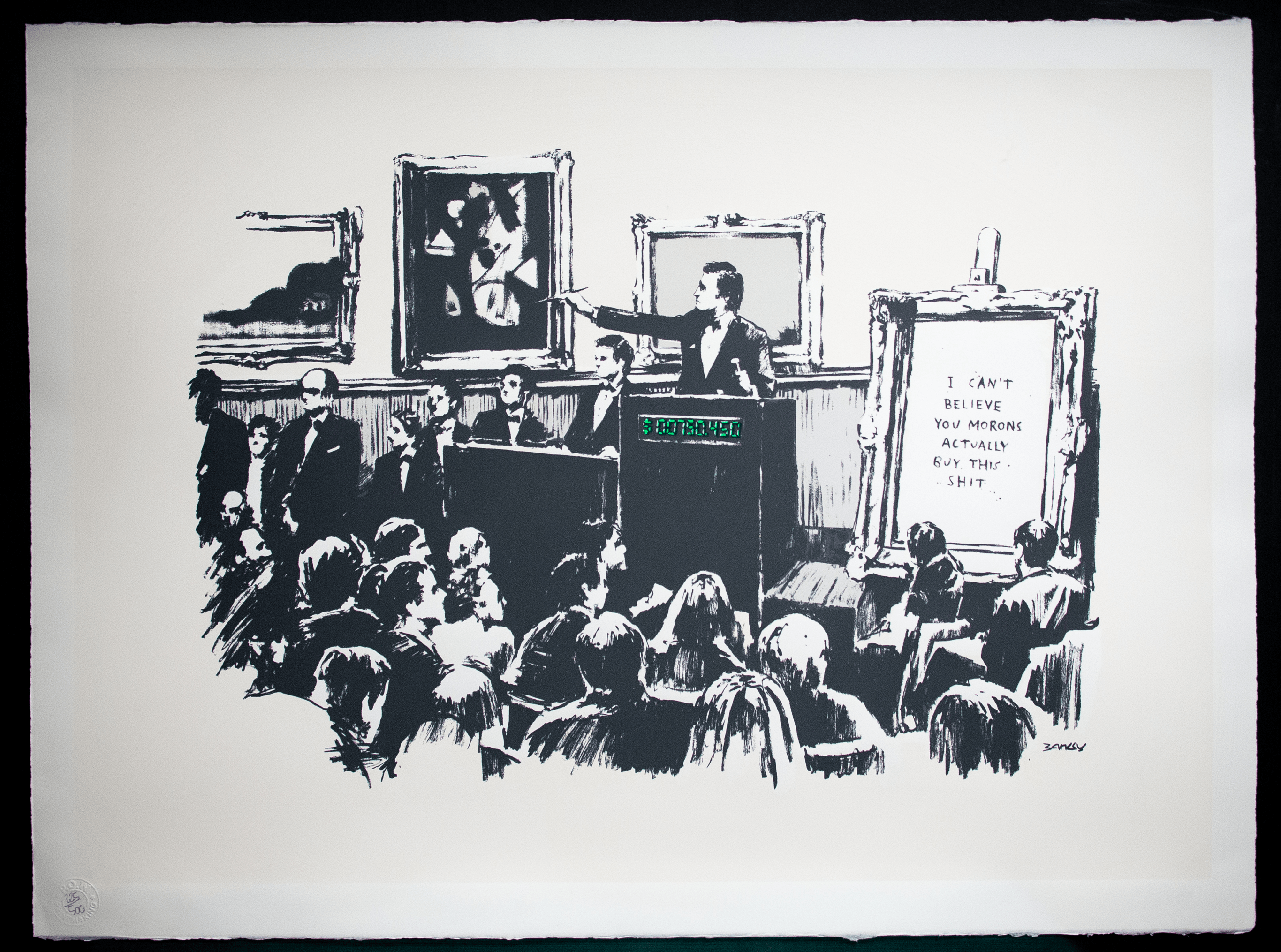 Banksy ตั้งใจล้อเลียนรูปถ่ายที่บันทึกเหตุการณ์งานประมูลหนึ่งในภาพชุดสีน้ำมันของวินเซนต์ แวน โก๊ะห์ (Vincent Van Gogh) ที่ชื่อว่า ‘Sunflower’ ณ สถาบันจัดการประมูลคริสตี้ส์ กรุงลอนดอน เมื่อปี 1987 โดยภาพดังกล่าวได้ถูกขายไปด้วยราคา 22.5 ล้านปอนด์
