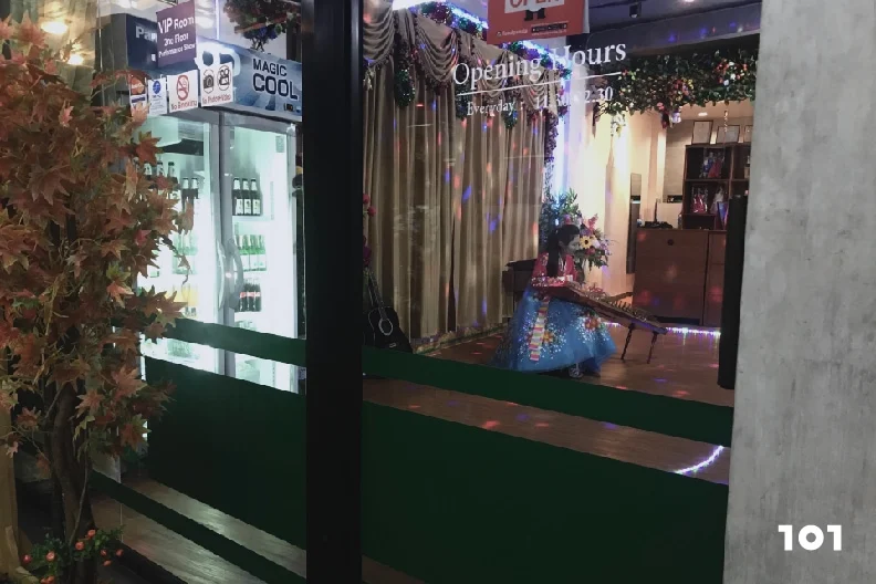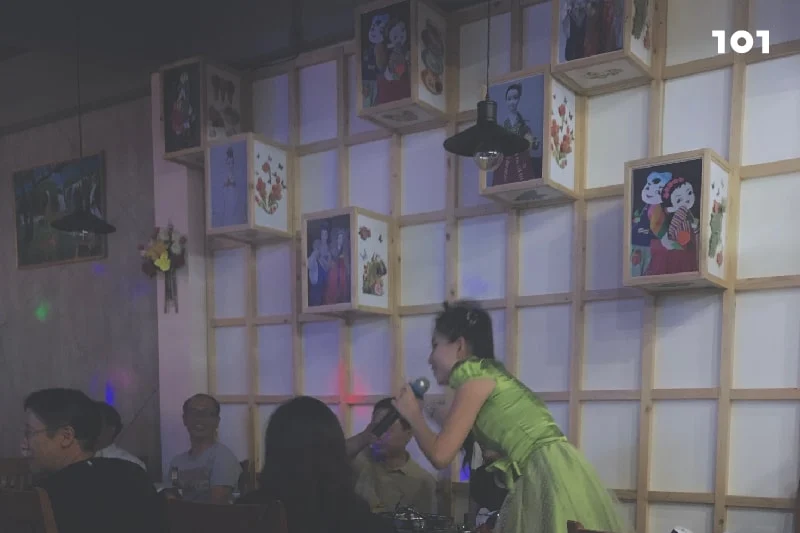 และอย่างที่พอจะเดาได้ พื้นที่ฝั่งหนึ่งของร้านถูกอุทิศให้กับเวทีการแสดงอันเป็นเอกลักษณ์ที่แบ่งโซนไว้ด้วยหลอดไฟคริสต์มาสวางโค้งอยู่บนพื้น ตามมาด้วยป้าย ‘ห้ามถ่ายภาพและวิดีโอ’ ตัวเบ้อเริ่มติดอยู่บนเสา คาราโอเกะประกอบเอ็มวีภาพท่านผู้นำบนจอโทรทัศน์ และขาดไม่ได้คือกล้องวงจรปิดบนเพดาน (ซึ่งก็มีกันทุกร้าน แต่พอมาอยู่ในร้านของเกาหลีเหนือ ก็ทำให้เกิดอาการหวาดระแวงอยู่ไม่น้อย)