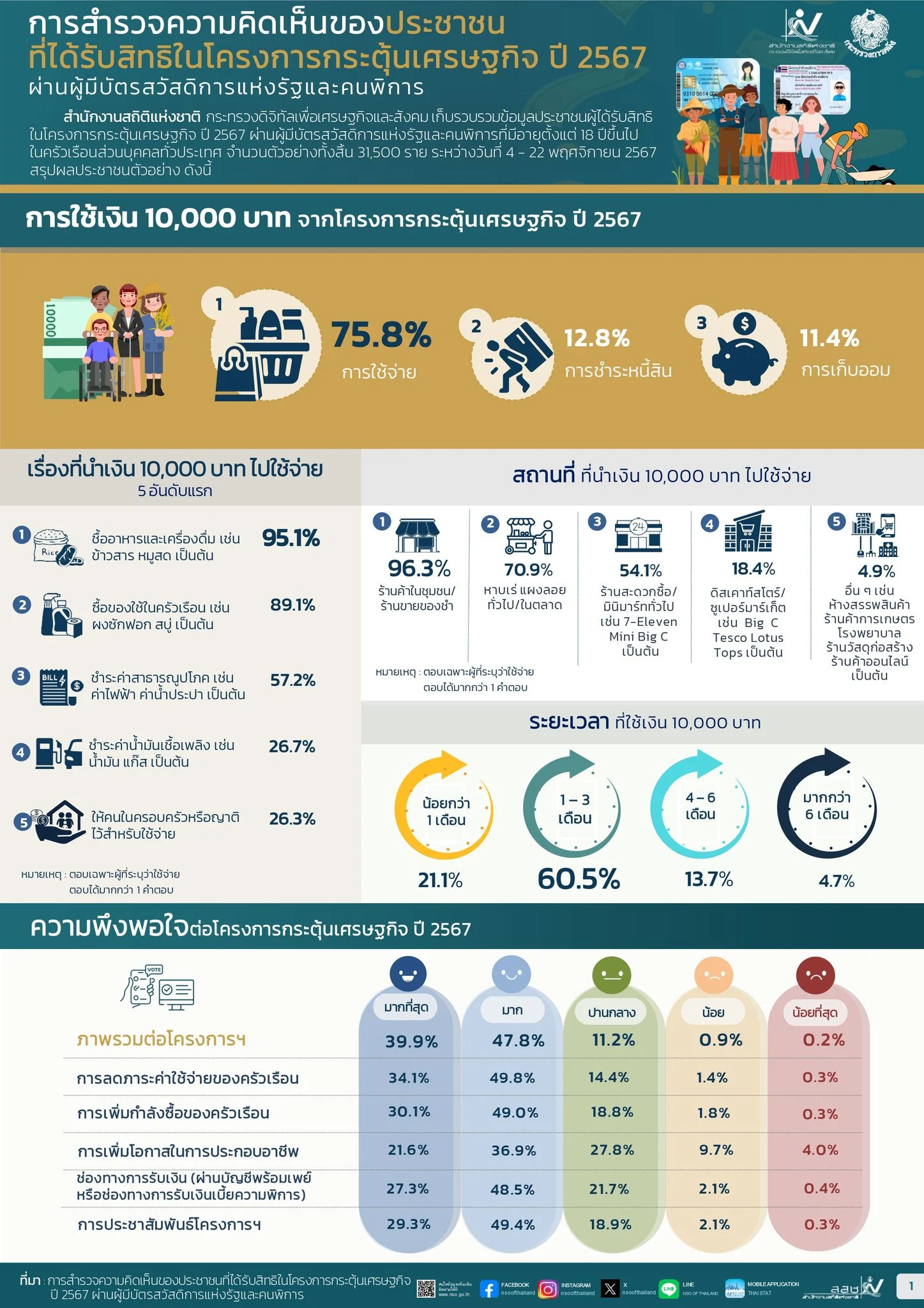 ↑5 | สำนักงานสถิติแห่งชาติ. การสำรวจความคิดเห็นของประชาชนที่ได้รับสิทธิในโครงการกระตุ้นเศรษฐกิจปี 2567 ผ่านผู้มีบัตรสวัสดิการแห่งรัฐและคนพิการ. 2024. |