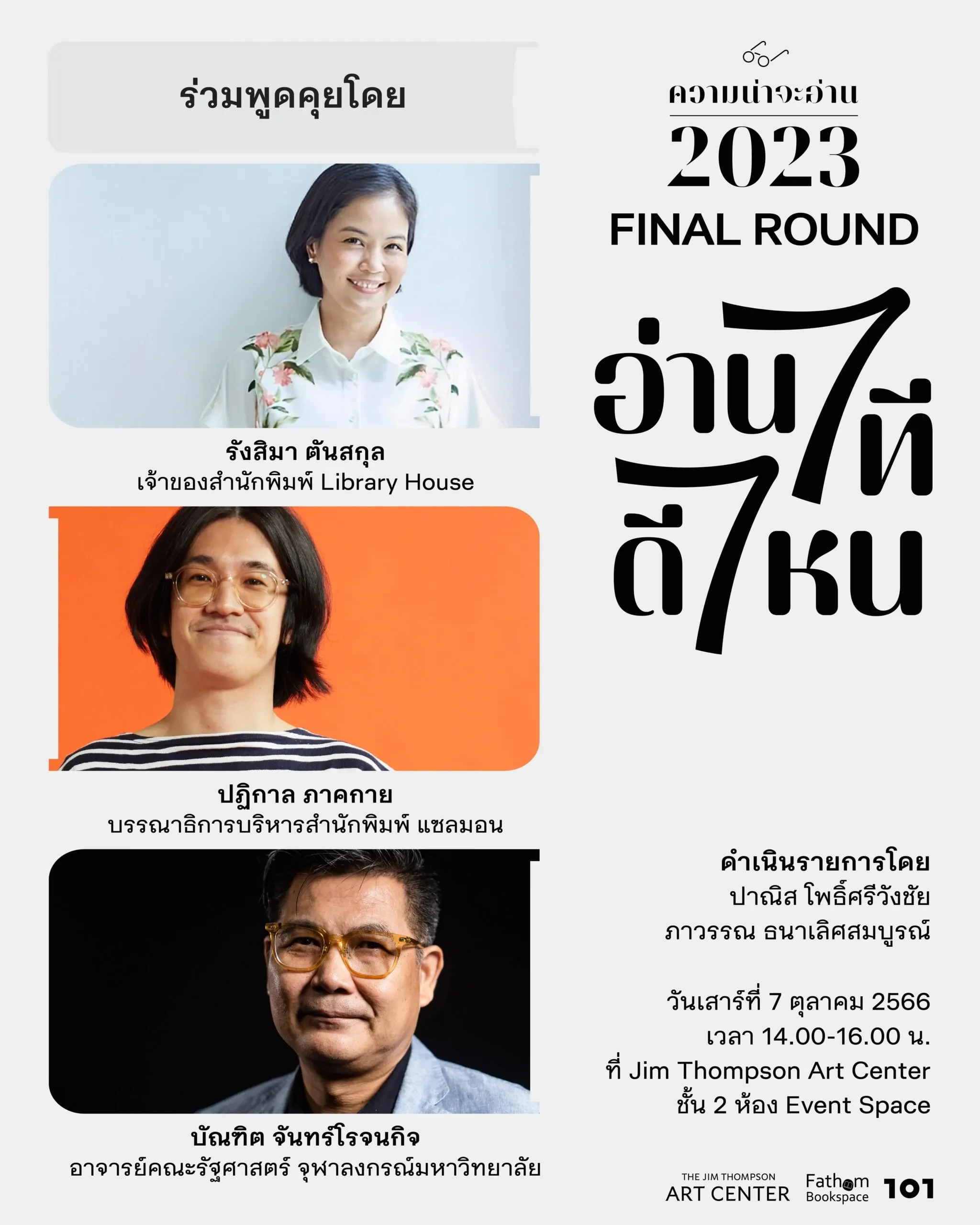 ผ่านพ้นไปแล้วกับการเปิดเผยรายชื่อหนังสือ ‘น่าจะอ่าน’ กว่า 100 เล่ม ที่ได้รับการคัดเลือกจากคนในวงการหนังสือและนักอ่านตัวยง 101 ร่วมกับ Jim Thompson Art Center และร้านหนังสือ Fathom Bookspace ขอเชิญมิตรนักอ่าน-เขียนทุกท่าน มาส่งท้ายเทศกาลความน่าจะอ่านไปด้วยกัน กับ วงเสวนา ‘ความน่าจะอ่าน 2023 Final Round – อ่าน 7 ที ดี 7 หน’