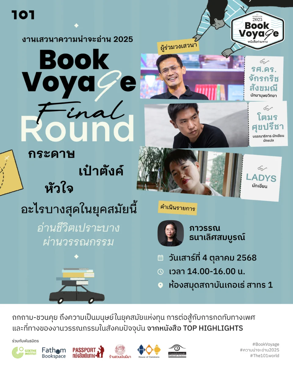 ในช่วงสุดท้ายของเทศกาล ‘ความน่าจะอ่าน 2025’ วันโอวัน ร่วมกับสถาบันเกอเธ่ ประเทศไทย ขอเชิญนักอ่าน-เขียนทุกท่าน มาร่วมงานเสวนาที่ว่าด้วยหนังสือในฐานะ ‘เพื่อนร่วมทาง’ ในวันที่โลกพลิกผัน กับวงเสวนา ‘ความน่าจะอ่าน 2025 – Book Voyage Final Round’