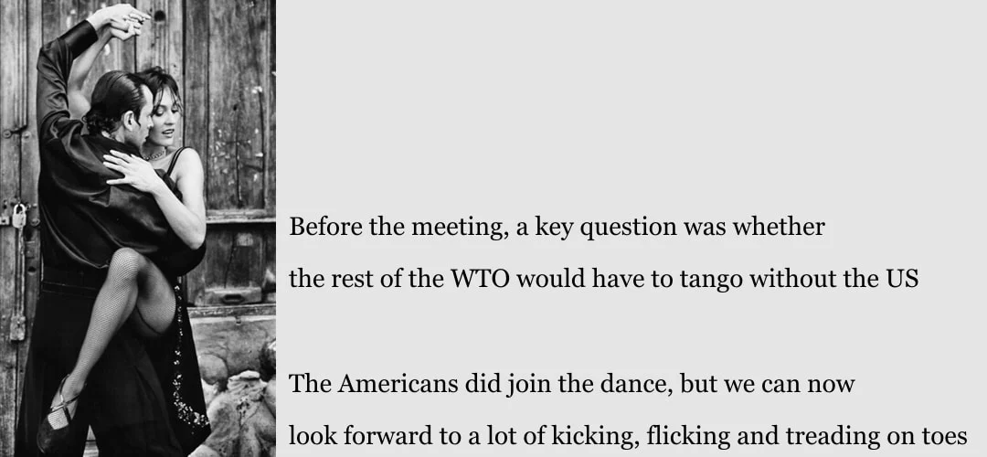 Before the meeting, a key question was whether the rest of the WTO would have to tango without the US. The Americans did join the dance, but we can now look forward to a lot of kicking, flicking and treading on toes.