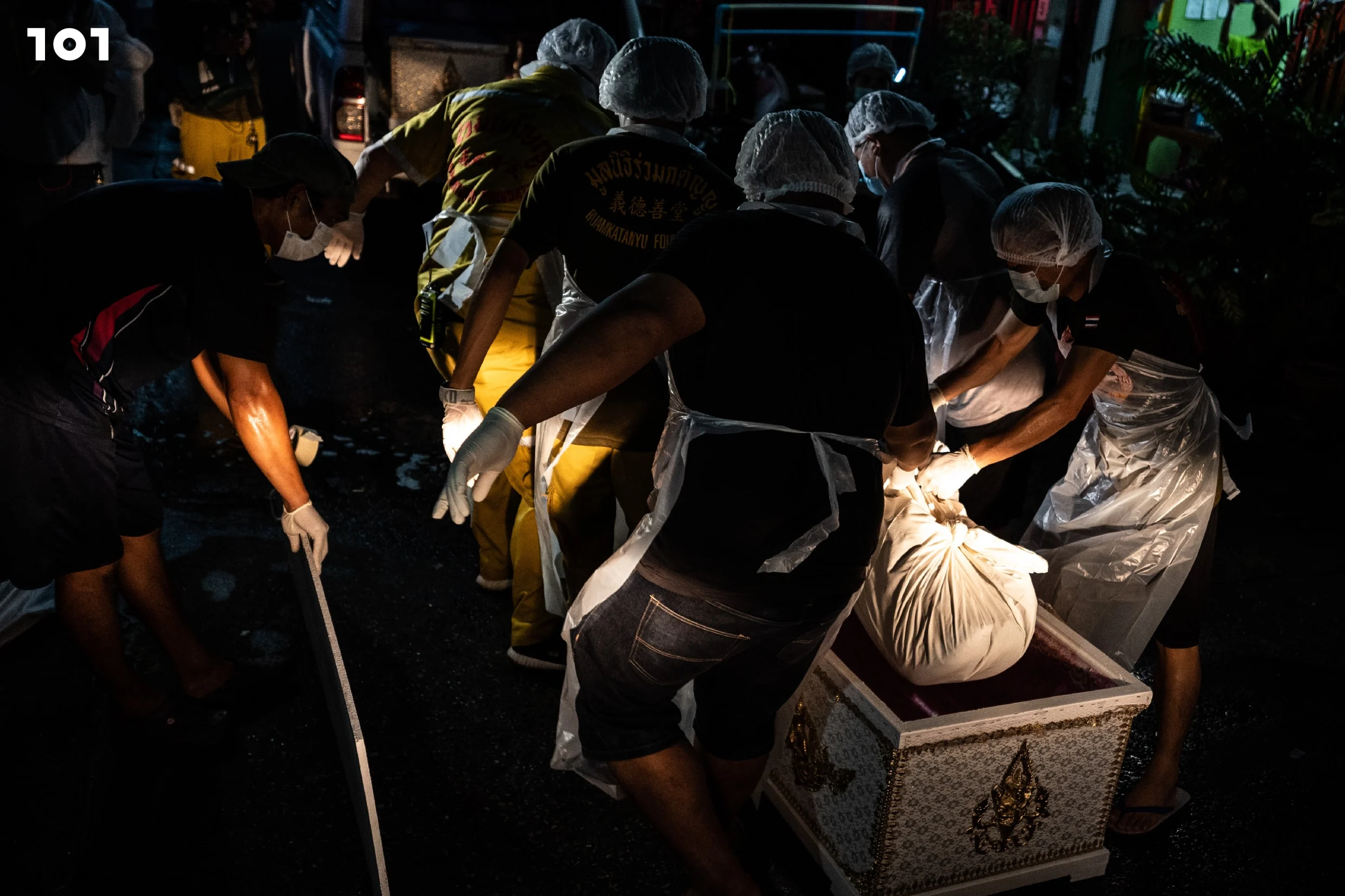จุดที่ศพตายใหม่ๆ มีสภาพไม่ต่างอะไรจากคนติดเชื้อ เพราะฉะนั้นการบรรจุศพลงถุงเป็นจุดที่มีความเสี่ยงสูง อันตราย เจ้าหน้าที่คนทำงานต้องปฏิบัติตาม guideline อย่างเคร่งครัด เช่น กำหนดมาว่าควรนำศพใส่ถุงยังไง ต้องใส่ถุงสองชั้น ใช้พนักงานช่วยกี่คน ต้องพ่นสเปรย์ฆ่าเชื้อตลอด ทุกคนมีหน้าที่และตำแหน่งชัดเจน รวมถึงจัดหาอุปกรณ์ให้คนทำงานอย่างชุด PPE ถุงมือ เพราะเขาเป็นกลุ่มเสี่ยงที่สุด