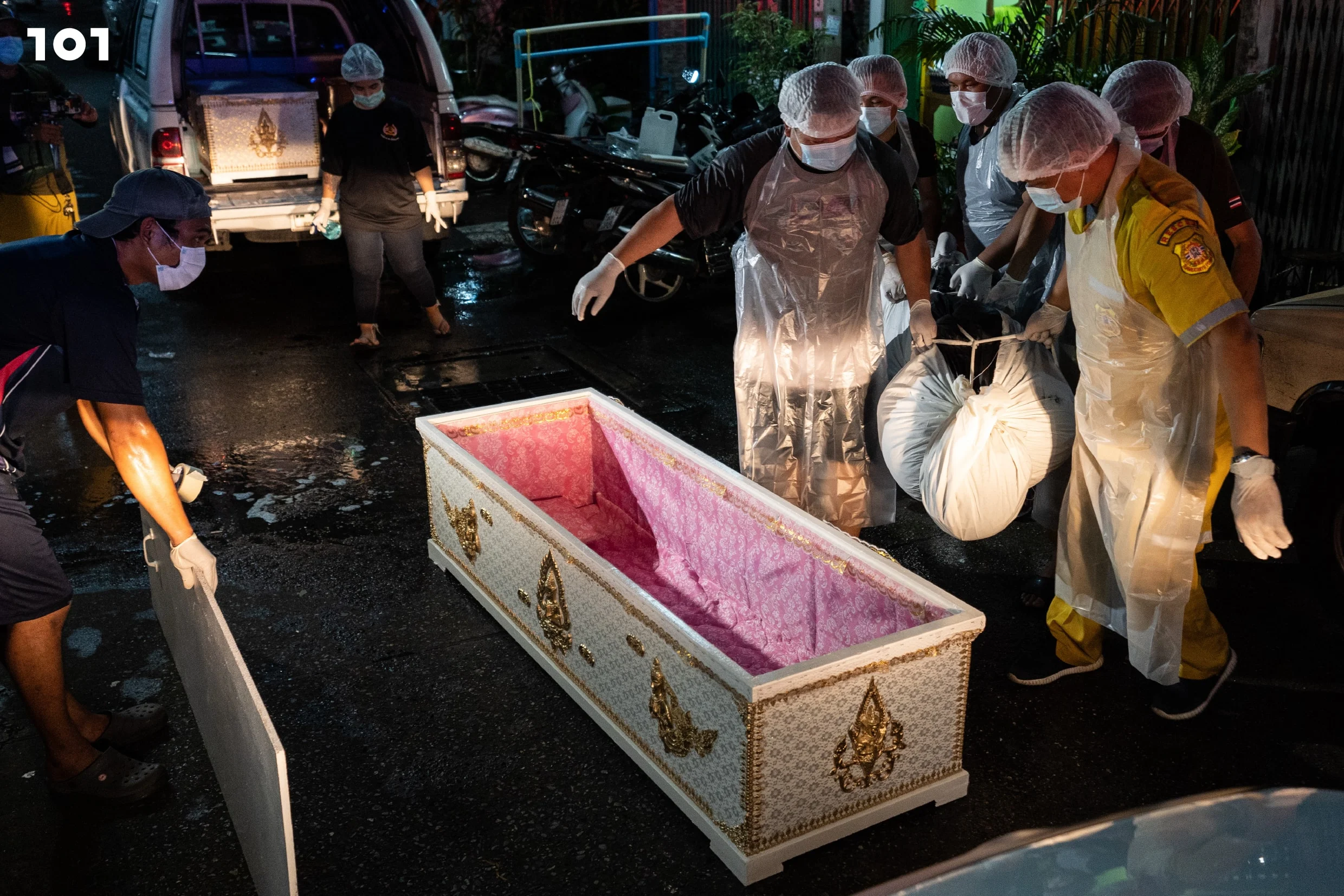 ทีนี้ศพติดเชื้อต้องจัดการยังไงบ้าง? เพื่อลดโอกาสเสี่ยงที่ศพจะแพร่เชื้อหรือเกิดการปนเปื้อน การจัดการศพจึงมีเงื่อนไขที่บีบคั้นมาก เรื่องแรกคือเวลา ศพต้องถูกจัดการอย่างรวดเร็ว การดำเนินการจากที่ตายสู่ที่เผาต้องเกิดขึ้นภายในระยะเวลาอันสั้น เพราะศพติดเชื้อไม่สามารถรับการฉีดยารักษาสภาพศพได้ จึงต้องรีบดำเนินการอย่างรวดเร็วก่อนที่ศพจะเน่าเปื่อย