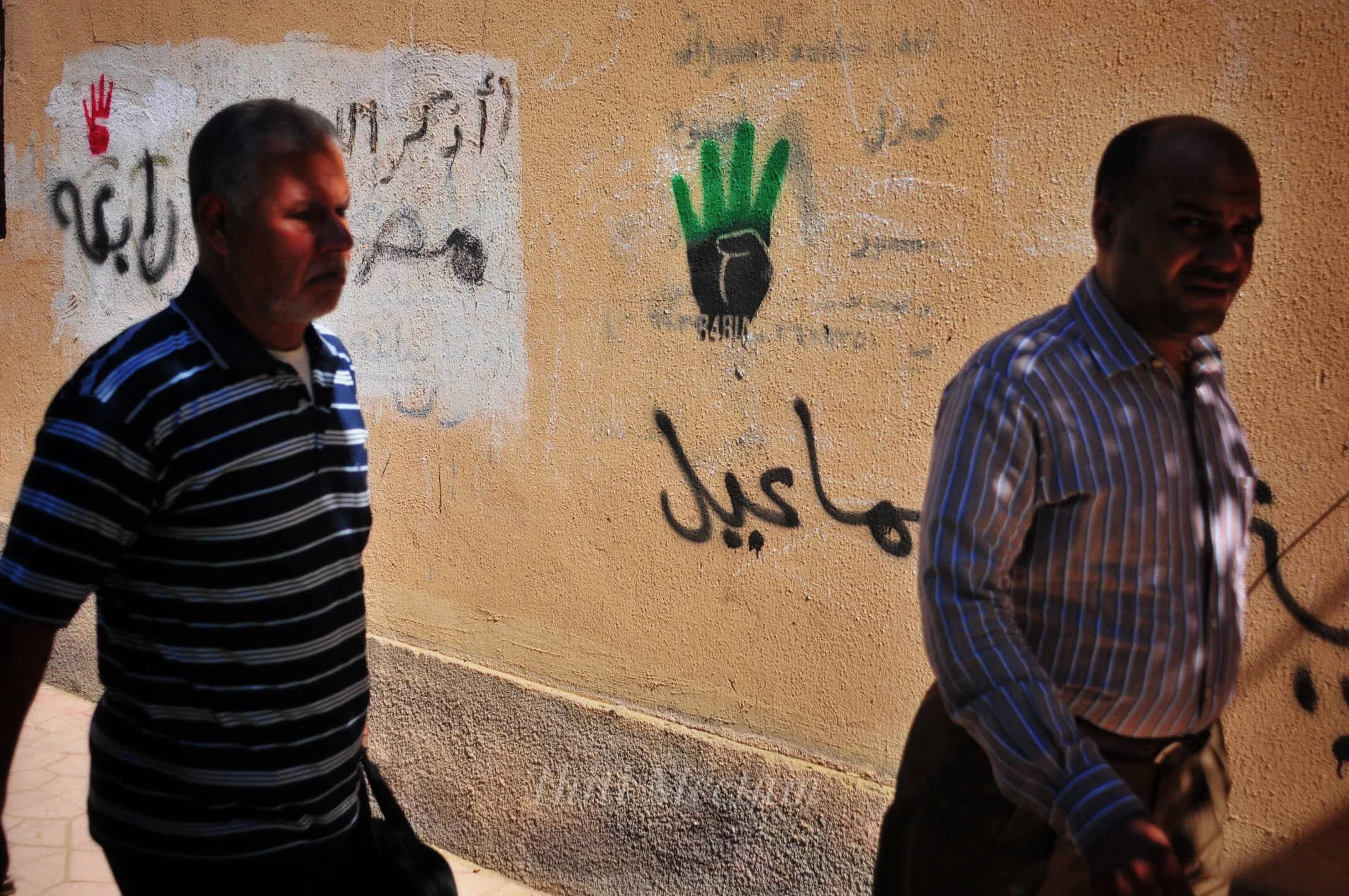 ตามกำแพงตึกเต็มไปด้วยสีสเปรย์พ่นภาษาอาหรับ และโปสเตอร์จำนวนมาก รูปภาพ พล.อ.อับเดล ฟัตตะห์ อัล-ซีซี ผู้บัญชาการทหารสูงสุด และผู้นำรัฐประหารหลายใบอยู่ในสภาพเอี่ยมอ่อง และอีกหลายใบอยู่ในสภาพขาดยุ่ย