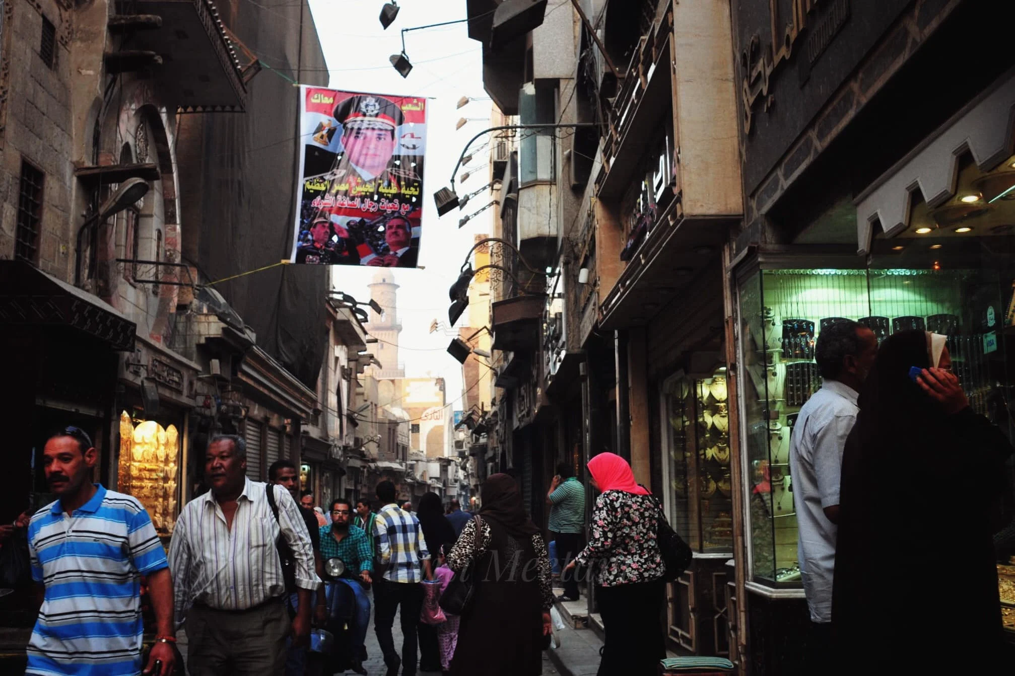 ทางเดินในตรอกตลาดข่านขึ้นป้ายไวนิลรูป พล.อ.อัล-ซีซี ผู้นำรัฐประหารเด่นชัด ถัดเข้าไปข้างในมีอีกหลายแผงลอยที่ขายเสื้อยืดสกรีนรูปผู้นำรัฐประหารด้วย