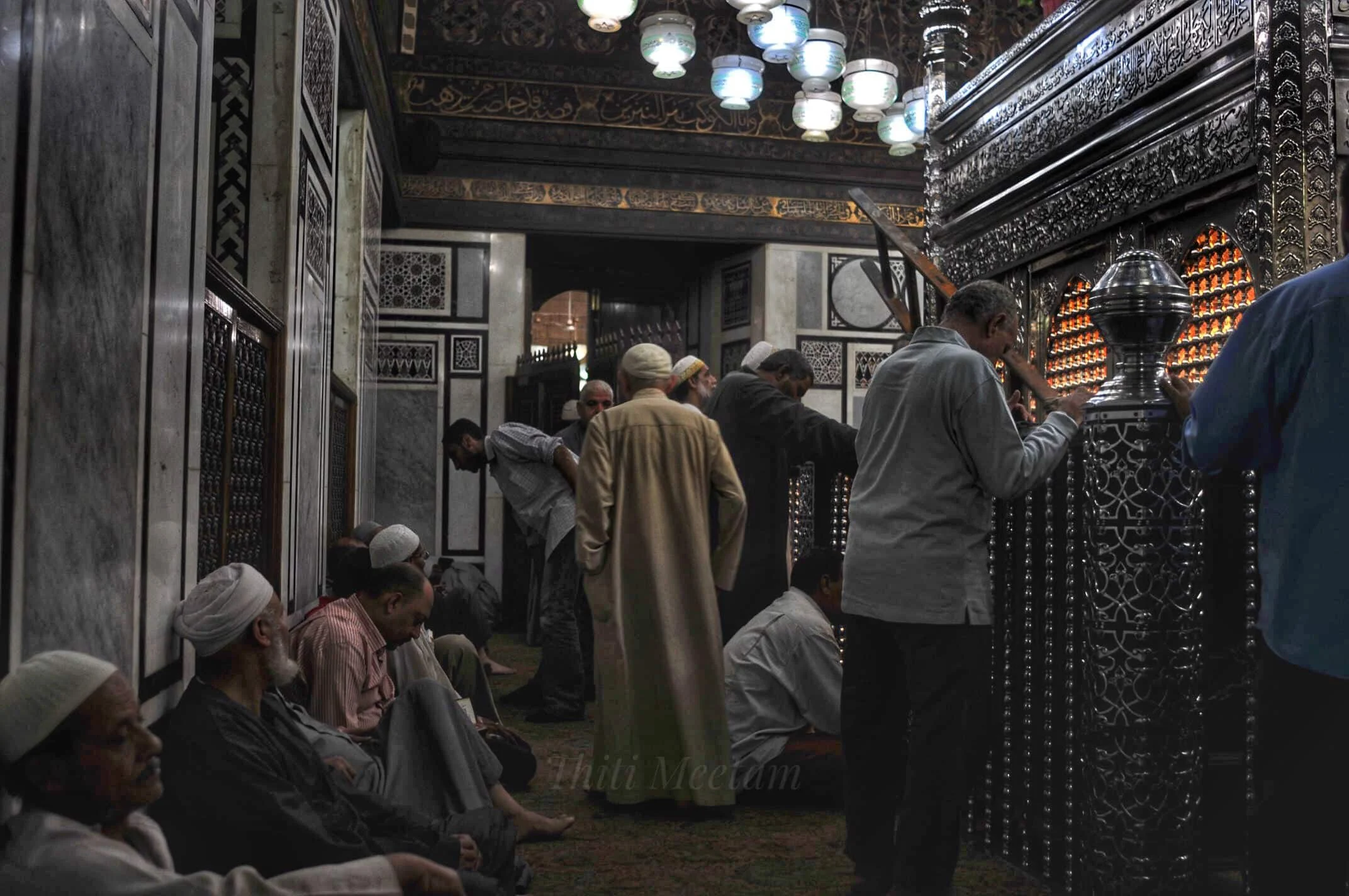 ฮัมเสาะ หะสาเมาะ นักศึกษาด้านการศึกษาอิสลาม ม.อัล-อัซฮัร หนุ่มจากรือเสาะ จ.นราธิวาส พาผมเข้าไปด้านใน ไม่ใช่แค่ชาวไคโรเข้ามาระลึกถึงศาสดาของพวกเขาเท่านั้น สำหรับบางคนก็คล้ายเป็นบ้านไปในเวลาเดียวกัน ความที่มัสยิดโอ่โถง เย็นและเงียบ เลยไม่น่าแปลกใจว่าทำไมนอกจากการละหมาด พวกเขายังใช้เป็นที่พักหลับนอนชั่วคราว