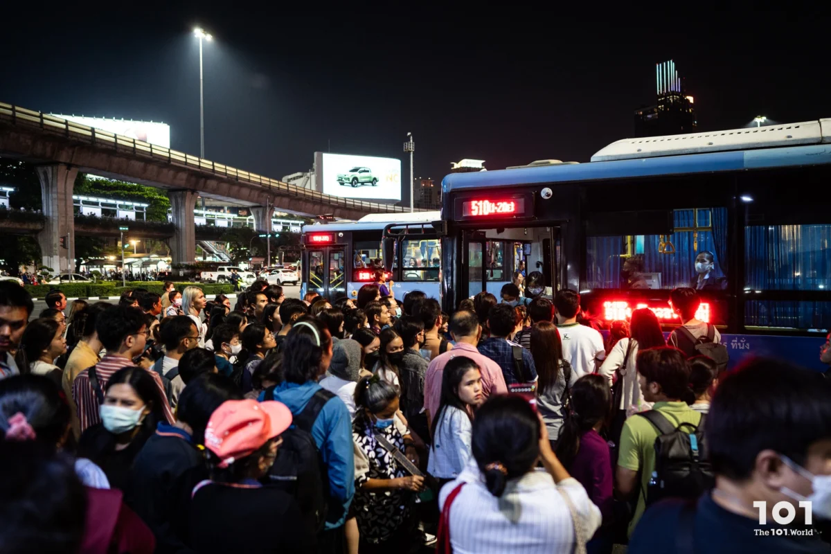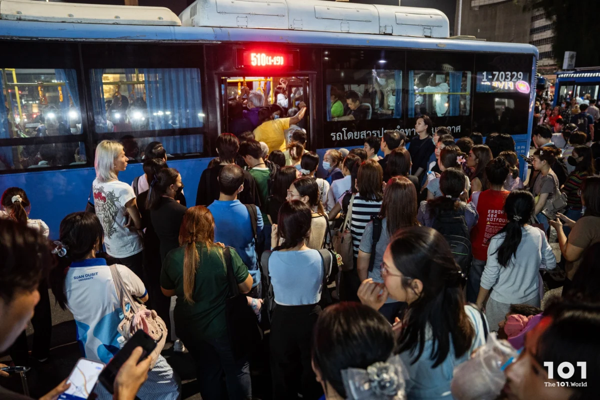รถไฟฟ้าปิด จราจรติดขัด ประชาชนแออัดรอรถเมล์ ยังไม่ได้กลับบ้านหลังแผ่นดินไหว