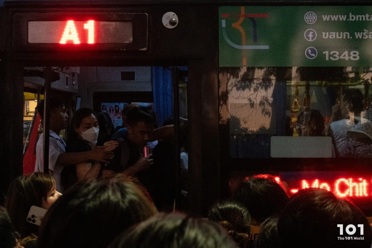 ที่อนุสาวรีย์ชัยสมรภูมิ ประชาชนจำนวนมากยืนรอรถเมล์แน่นเต็มเกาะพหลโยธิน และเมื่อรถเมล์เคลื่อนมาจอดเทียบป้าย ผู้โดยสารต่างขึ้นรถและแทรกตัวเข้าไปจนแทบไม่เหลือที่ว่าง ทำให้รถโดยสารทุกคันเต็มตั้งแต่ต้นทาง จนผู้โดยสารที่รอรถเมล์ตามป้ายถัดไปไม่สามารถขึ้นรถและต้องยืนรอรถเมล์ต่อ