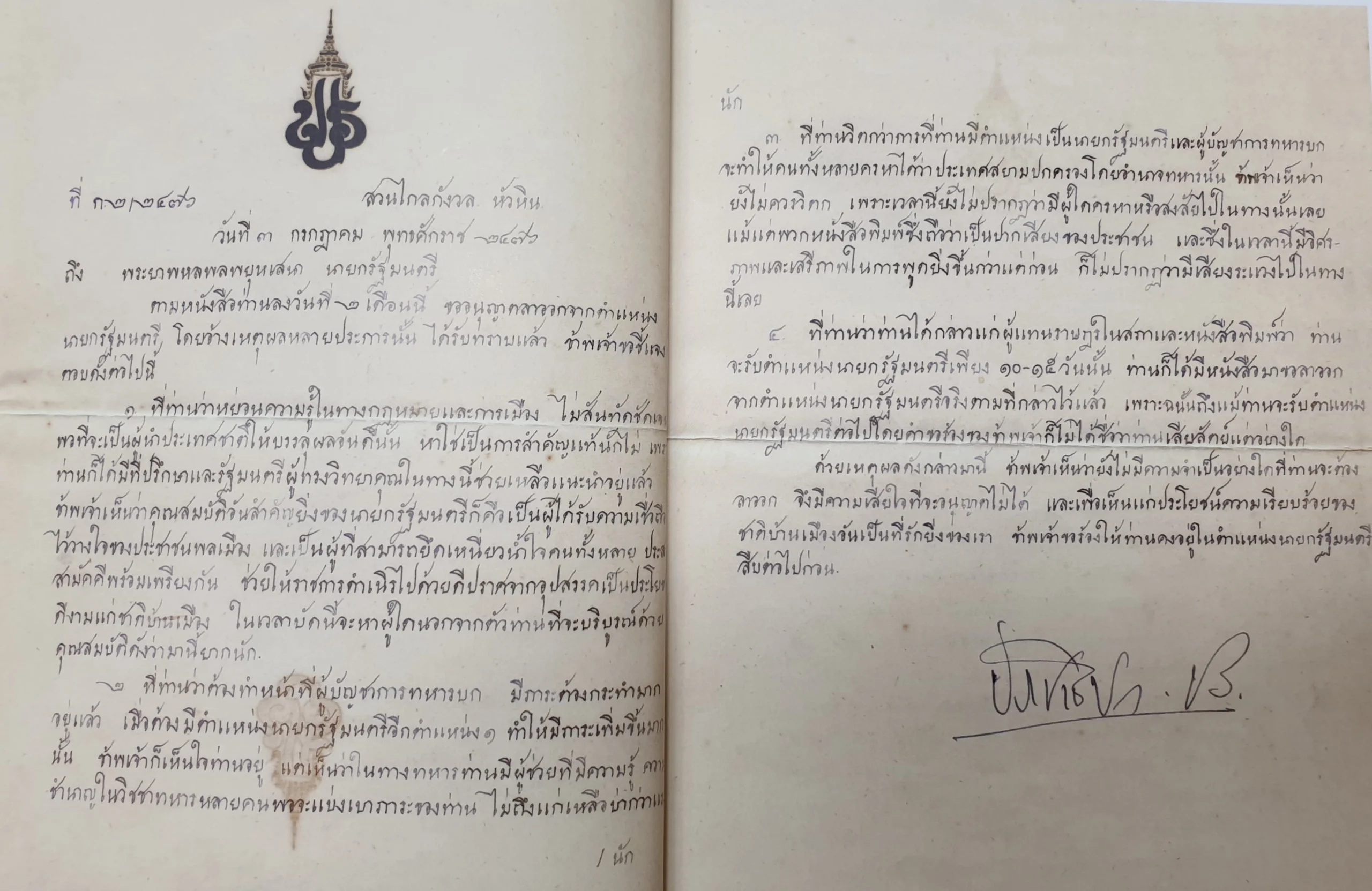 “นี่แหละคุณ เมื่อผมได้ลั่นวาจาไว้เช่นนั้นแก่เขาแล้ว ผมจะกลับเข้ามารับตำแหน่งนั้นสืบต่อจากเขา เขาก็อาจคิดไปว่าผมมาชิงตำแหน่งนายกรัฐมนตรีจากเขาไป และวาจาของผมก็จะไม่เปนวาจาสัตย์ ผมอยู่ในที่เปนผู้ใหญ่ ก็ตั้งใจจะไม่ให้ผู้มาทีหลังเขาดูแคลนวาจาของเราได้ นี่แหละคุณเป็นเหตุผลประกอบที่ทำให้ผมจำต้องปฏิเสธการรับตำแหน่งนายกรัฐมนตรีสืบต่อจากคุณหลวงพิบูล”