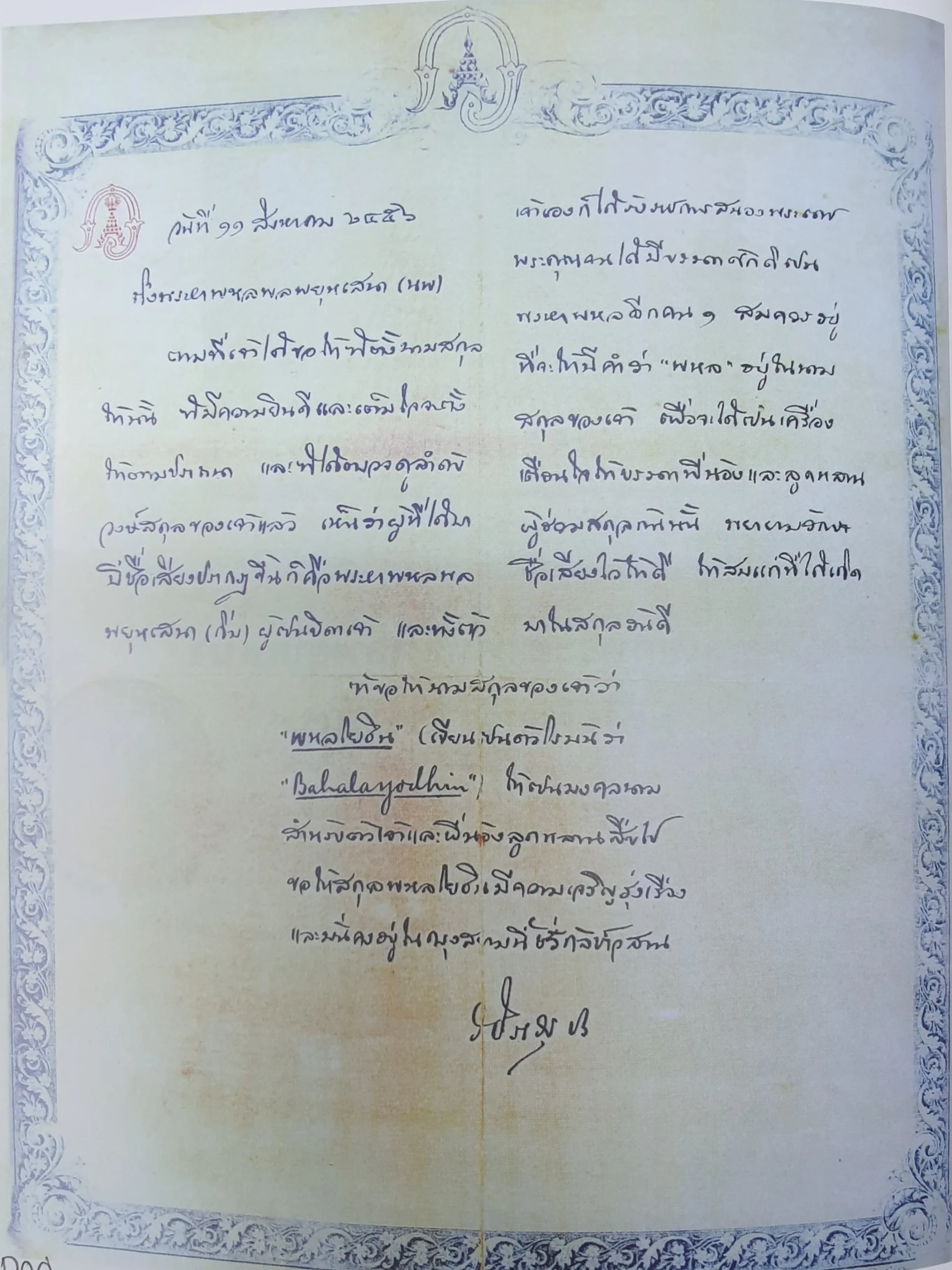 ข้าขอให้นามสกุลของเจ้าว่า “พหลโยธิน” (เขียนเปนตัวโรมันว่า Bahalayodhin) ให้เปนมงคลนามสำหรับตัวเจ้าและพี่น้องลูกหลานสืบไป ขอให้สกุลพหลโยธินมีความเจริญรุ่งเรืองและมั่นคงอยู่ในกรุงสยามนี้ชั่วกัลปาวสาน”
