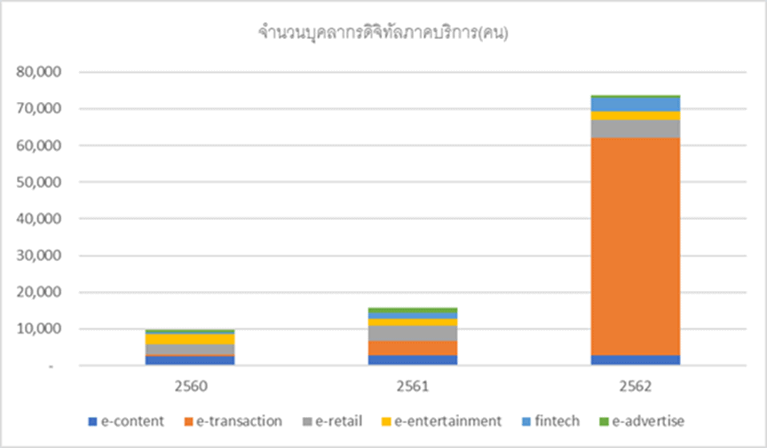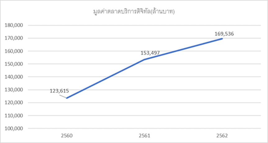 ที่มา: สำนักงานส่งเสริมเศรษฐกิจดิจิทัล (2563), ผลสำรวจข้อมูลและการประเมินสถานภาพอุตสาหกรรมดิจิทัลปี 2561–2562 คาดการณ์ 3 ปี[2]