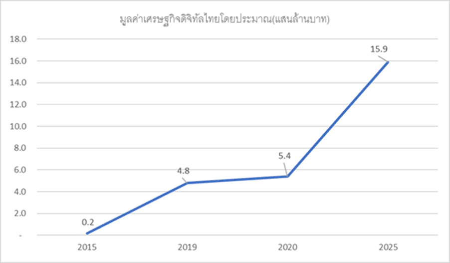 สำหรับในประเทศไทย มูลค่าเศรษฐกิจดิจิทัลของไทยในปี 2020 อยู่ที่ 5.4 แสนล้านบาท โดยมีอัตราการเติบโตจากปี 2019 อยู่ที่ 7 เปอร์เซ็นต์ (Thailand e-conomy SEA, 2020) รายงานของ Google คาดการณ์ว่าในปี 2025 เศรษฐกิจดิจิทัลของไทยจะขยายตัวจนมีมูลค่ามากกว่าปัจจุบันเกือบสามเท่าที่ 15.9 แสนล้านบาท สำหรับมูลค่าการลงทุนในเศรษฐกิจดิจิทัลของประเทศไทยนั้นในปี 2019 อยู่ที่ 5.5 พันล้านบาท โดยเพิ่มจากปี 2018 ที่มูลค่าอยู่ที่ 3.8 พันล้านบาท