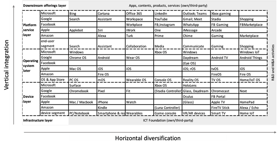 Gleiss และคณะ เสนอภาพใหญ่ในการทำความเข้าใจการแผ่ขยายอำนาจของแพลตฟอร์ม โดยมองว่า แพลตฟอร์มขนาดใหญ่มีแนวโน้มจะแผ่อำนาจในแนวตั้ง 3 ระดับ คือ (1) แพลตฟอร์มส่วนมากเป็นเจ้าของอุปกรณ์ที่จับต้องได้ (device layer) เช่น Apple ที่เป็นเจ้าของ MacBook และ iPhone ซึ่งสามารถเชื่อมต่อกับระบบอินเทอร์เน็ต (2) การเป็นเจ้าของอุปกรณ์ (device) ทำให้แพลตฟอร์มขนาดใหญ่สามารถที่จะควบคุม Operating System (OS) ที่จะถูกนำมาลงใน device ได้ และ (3) แพลตฟอร์มสามารถที่จะควบคุมแอปพลิเคชันที่ถูกนำมาลงใน device ต่างๆ อีกทีหนึ่ง (platform service layer) ดังนั้น แพลตฟอร์มขนาดใหญ่จึงเหมือนมีประตูที่สามารถเปิดเข้าสู่ฐานผู้ใช้