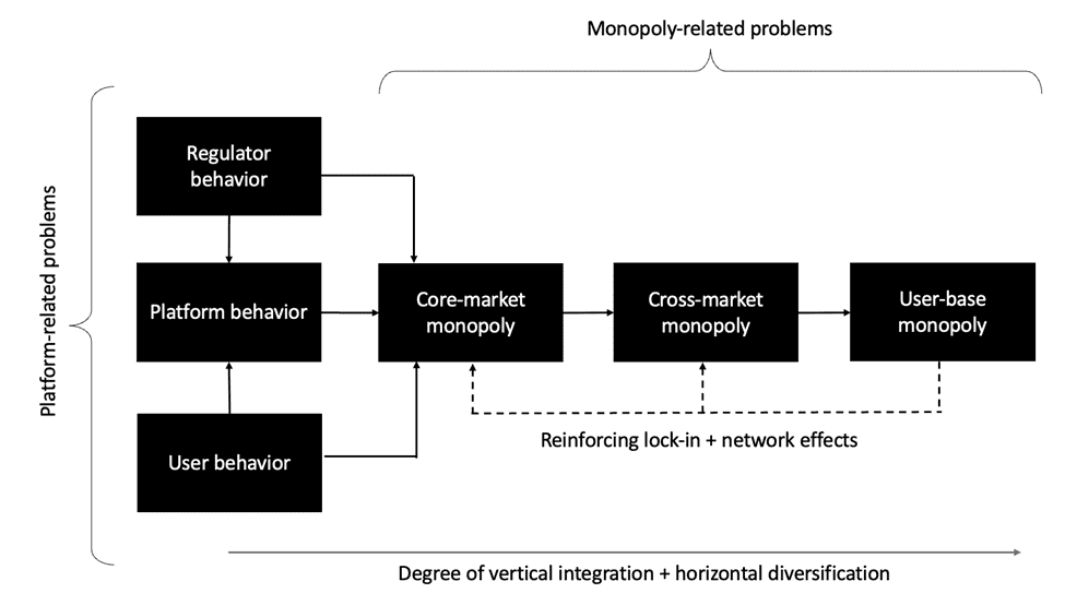 เส้นทางการพัฒนาของแพลตฟอร์มดิจิทัลอาจเริ่มด้วยการเป็นแพลตฟอร์มขนาดเล็กธรรมดา จนขยายใหญ่ขึ้นเรื่อยๆ และมีแนวโน้มที่จะกินรวบตลาดในที่สุด ด้วยปัจจัยจากการปฏิสัมพันธ์ระหว่างแพลตฟอร์ม ผู้กำกับดูแลแพลตฟอร์ม และผู้ใช้แพลตฟอร์ม (platform-related problems) หลังจากนั้นแพลตฟอร์มจึงเริ่มแผ่อำนาจไปตลาดอื่นๆ ที่ไม่ใช่ตลาดหลักของตัวเอง โดยอาจเริ่มกระทำการรวมหน่วยตามแนวยืน (vertical integration) ไปจนสุดท้ายแล้วแพลตฟอร์มอาจสามารถเข้าถึงผู้ใช้ได้โดยตรง พร้อมเกิดการขังผู้ใช้ไว้ในแพลตฟอร์ม (user-base monopoly) เมื่อแพลตฟอร์มมีลูกค้าอยู่ในมือแล้ว ตลาดหลักของแพลตฟอร์มจะยิ่งมีความแข็งแกร่งมากยิ่งขึ้น ทั้งยังเอื้อให้แพลตฟอร์มขนาดเข้าไปในตลาดอื่นๆ (horizontal diversification) ได้อีกด้วย (monopoly-related problem)