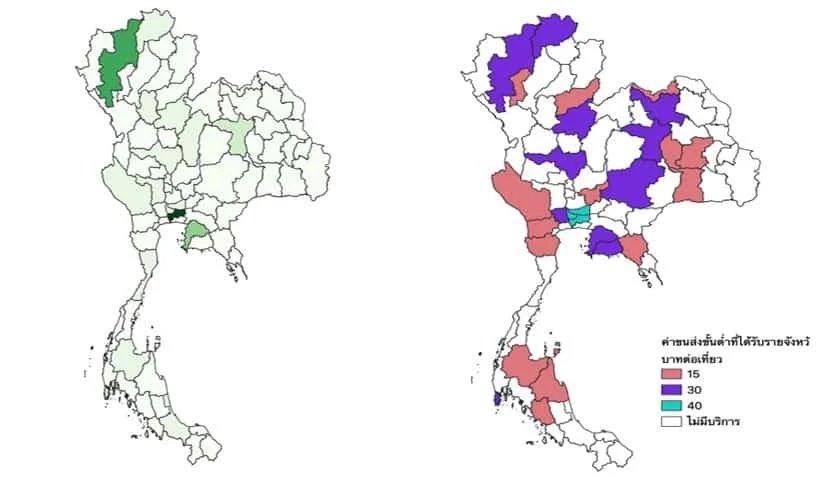 การวิเคราะห์ทำได้โดยการนำเอาข้อมูลโครงสร้างค่าจ้างการขนส่งของพาร์ทเนอร์ของ Grab ที่มีระดับราคาเริ่มต้นสามระดับที่แตกต่างกันในแต่ละจังหวัด (15, 30 และ 40 บาทต่อเที่ยว) มาเปรียบเทียบกับแผนที่ความหนาแน่นของร้านค้าตามที่ปรากฎในรูปที่ 1 ด้านบน เราจะพบว่ากลุ่มจังหวัดที่มีความหนาแน่นของร้านค้ามากก็จะมีระดับค่าจ้างเริ่มต้นต่อเที่ยวที่มากตามไปด้วย ความแตกต่างนี้ยิ่งสะท้อนว่านอกจากจะมีความเหลื่อมล้ำในด้านปริมาณงานที่มีโอกาสได้รับในแต่ละพื้นที่แล้ว ยังมีความเหลื่อมล้ำอยู่ในค่าจ้างขนส่งด้วย