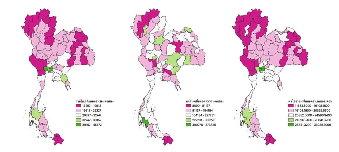 รูปที่ 3 : แผนที่แสดงระดับรายได้ หนี้สิน และค่าใช้จ่ายเฉลี่ยของครัวเรือน รายจังหวัดในปี พ.ศ. 2562