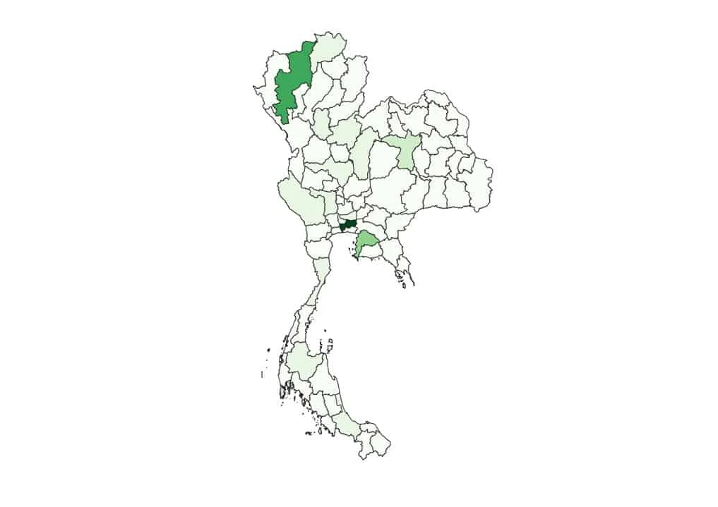 จากภาพ เราจะเห็นได้ว่าความหนาแน่นของร้านค้าที่เป็นไปได้ที่จะมีความต้องการสั่งอาหารของลูกค้าผ่านทาง Grab มักจะอยู่ตามหัวเมืองใหญ่ เช่น กรุงเทพฯ และปริมณฑล และเชียงใหม่ มากกว่ากลุ่มจังหวัดอื่นมาก เราจึงอนุมานได้ว่าปริมาณงานส่งอาหารที่ผู้ให้บริการจะได้รับนั้นจะกระจุกตัวอยู่ในจังหวัดเหล่านี้มากกว่าจังหวัดอื่นเช่นกัน ซึ่งนำไปสู่ความเหลื่อมล้ำในโอกาสการได้รับงานระหว่างแรงงานที่อยู่ในพื้นที่ร้านค้าหนาแน่นกับพื้นที่อื่น