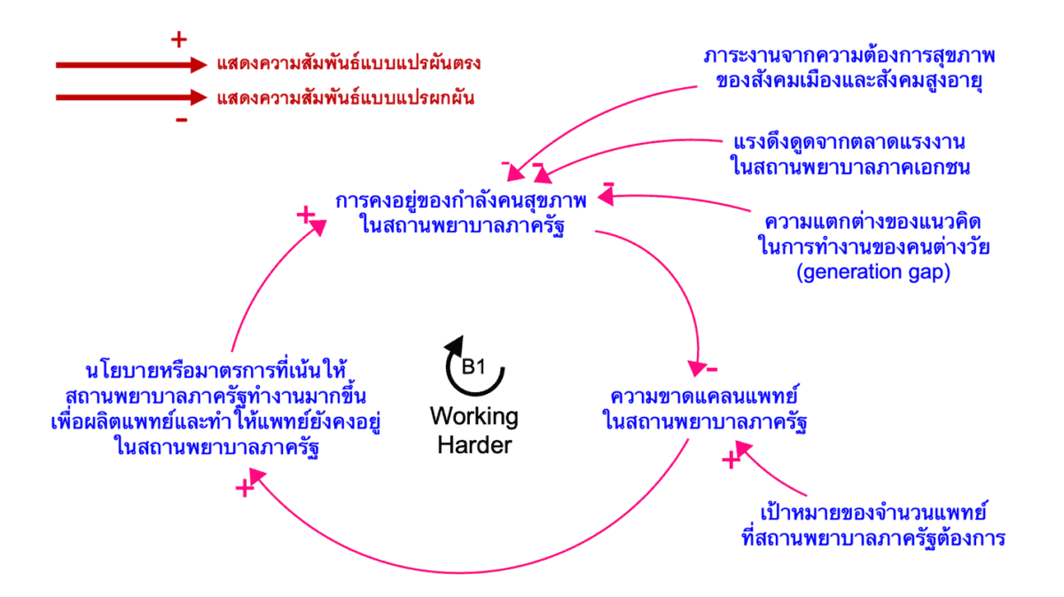 อย่างไรก็ตามภาระงานของภาครัฐที่เพิ่มขึ้นอย่างรวดเร็วจากการเพิ่มขึ้นของความต้องการสุขภาพของประชาชนในระยะหลัง ไม่ว่าจะเกิดจากระบบประกันสุขภาพถ้วนหน้าที่ทำให้ประชาชนมีอุปสรรคในการเข้าถึงบริการสุขภาพลดลง การเปลี่ยนแปลงเป็นสังคมเมืองและสังคมสูงอายุ การเพิ่มขึ้นของโรคไม่ติดต่อเรื้อรัง การเกิดโรคติดเชื้ออุบัติใหม่ที่เรามีเพิ่งประสบการณ์ในช่วงการระบาดใหญ่ของโควิด-19 การเติบโตของสถานพยาบาลภาคเอกชนที่ทำให้เกิดแรงดึงดูดกำลังคนด้านสุขภาพจำนวนมากออกจากภาครัฐ แม้กระทั่งความแตกต่างของแนวคิดในการทำงานของคนต่างวัยที่ต้องทำงานร่วมกันในสถานพยาบาลภาครัฐซึ่งสอดคล้องกับการเปลี่ยนแปลงของสังคมไทยในระยะหลัง ล้วนมีส่วนทำให้การคงอยู่ของกำลังคนด้านสุขภาพในภาครัฐลดลงและทำให้มาตรการที่มุ่งเน้นการจัดการกำลังคนด้านสุขภาพเพื่อให้ระบบบริการสุขภาพภาครัฐทำงานได้มากขึ้นหรือหนักขึ้นที่เคยทำงานได้ผลในอดีตเริ่มได้ผลน้อยลง ดังแสดงในภาพที่ 1