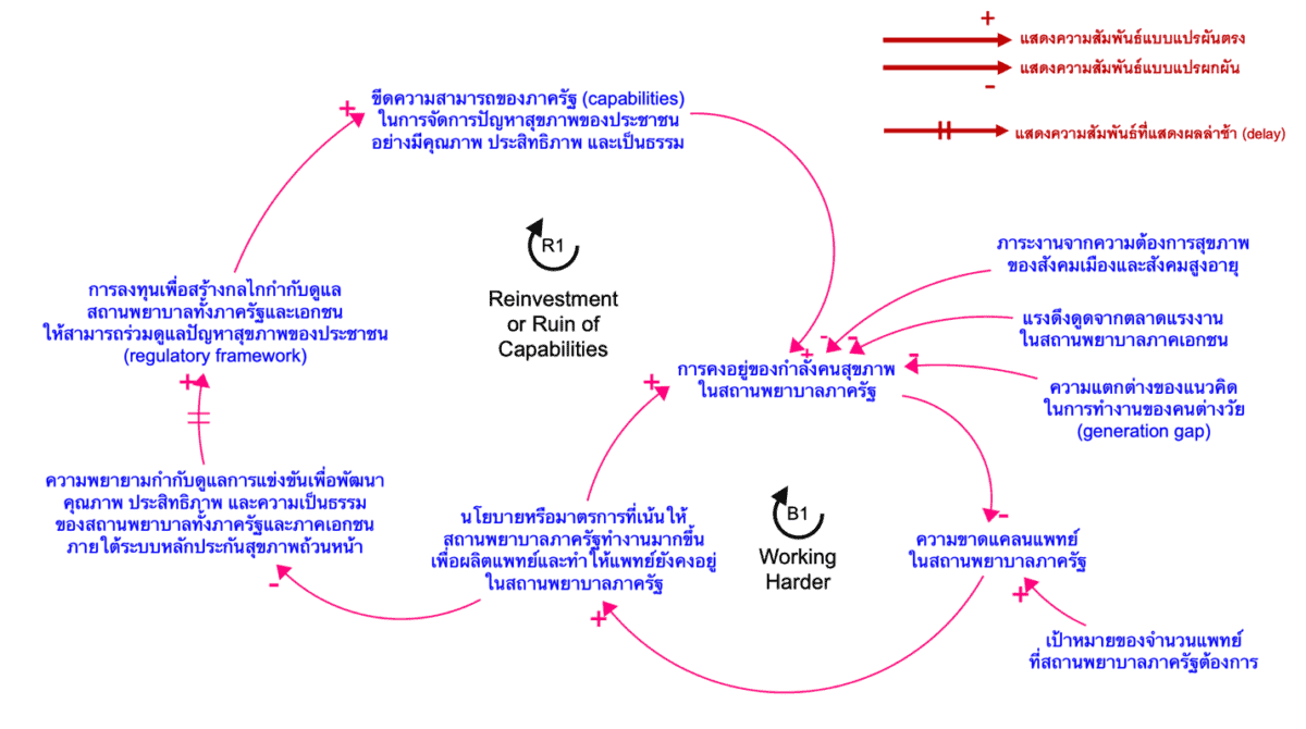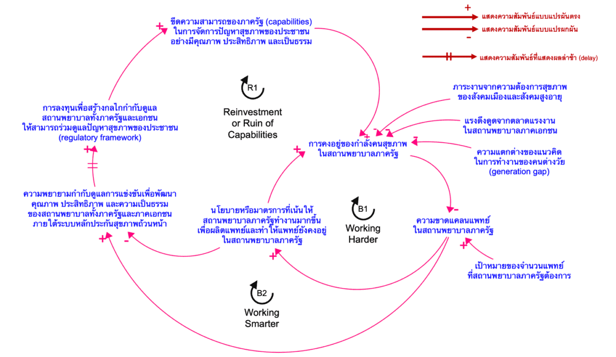 ดังนั้น ‘จุดคานงัดของระบบ’ (high-leverage points within systems) ซึ่งมีพลังมากที่สุดในการแก้ไขปัญหาความขาดแคลนบุคลากรสุขภาพในระบบสุขภาพภาครัฐ คือ 1) การลดข้อจำกัดของการบริหารงานแบบราชการของหน่วยบริการสุขภาพภาครัฐ และ 2) การพัฒนากลไกกำกับดูแลสถานพยาบาลของผู้กำหนดนโยบายภาครัฐเพื่อสร้างแรงจูงใจให้เกิดการแข่งขันอย่างเป็นธรรมระหว่างสถานพยาบาลภาครัฐและภาคเอกชน