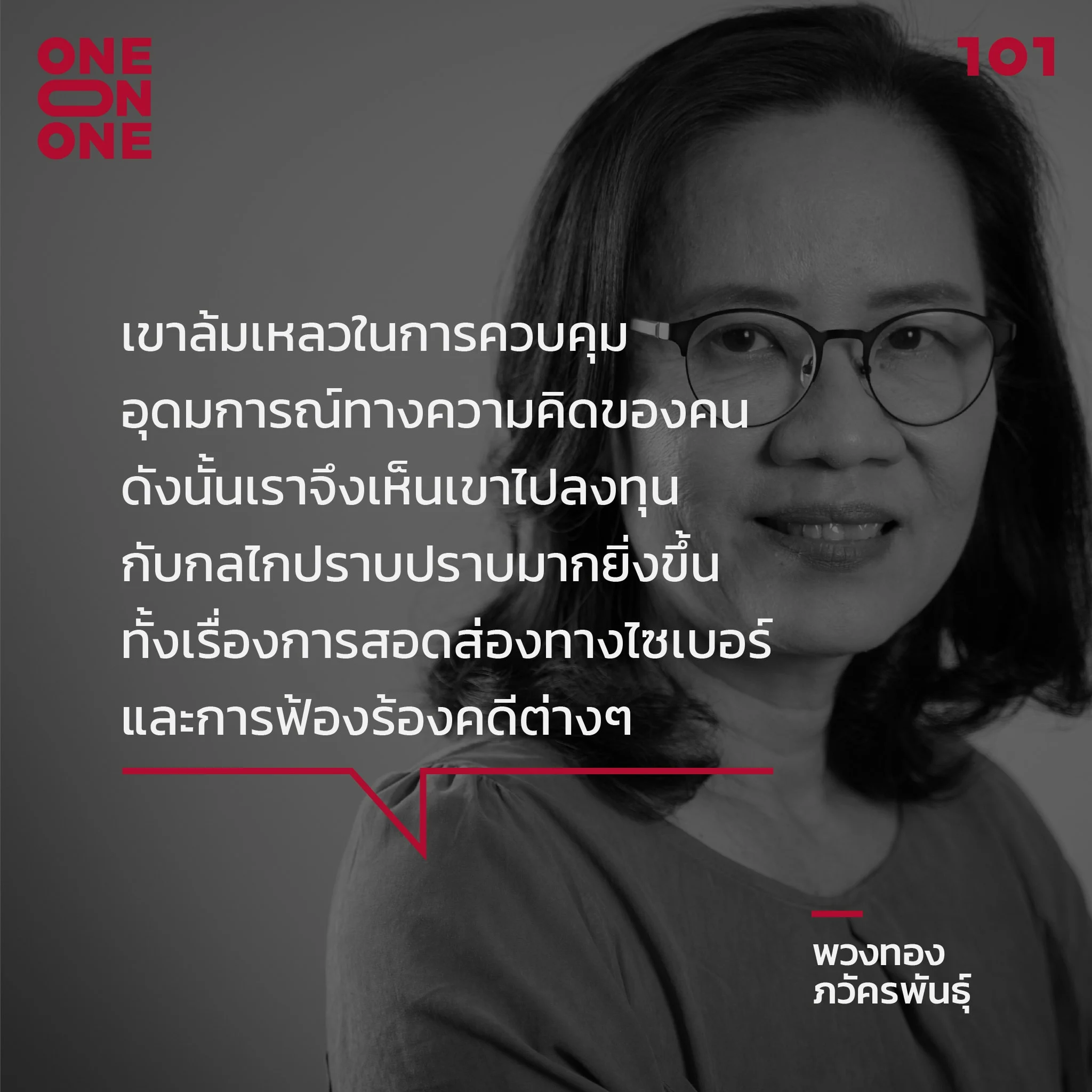 สิ่งที่เขาล้มเหลวในปัจจุบันคือการควบคุมอุดมการณ์ทางความคิดของคน ดังนั้นเราจึงเห็นเขาไปลงทุนกับกลไกปราบปราบมากยิ่งขึ้น ทั้งเรื่องการสอดส่องทางไซเบอร์ และการฟ้องร้องคดีต่างๆ เช่น มาตรา 116 มาตรา 44 และ พ.ร.บ.คอมพิวเตอร์