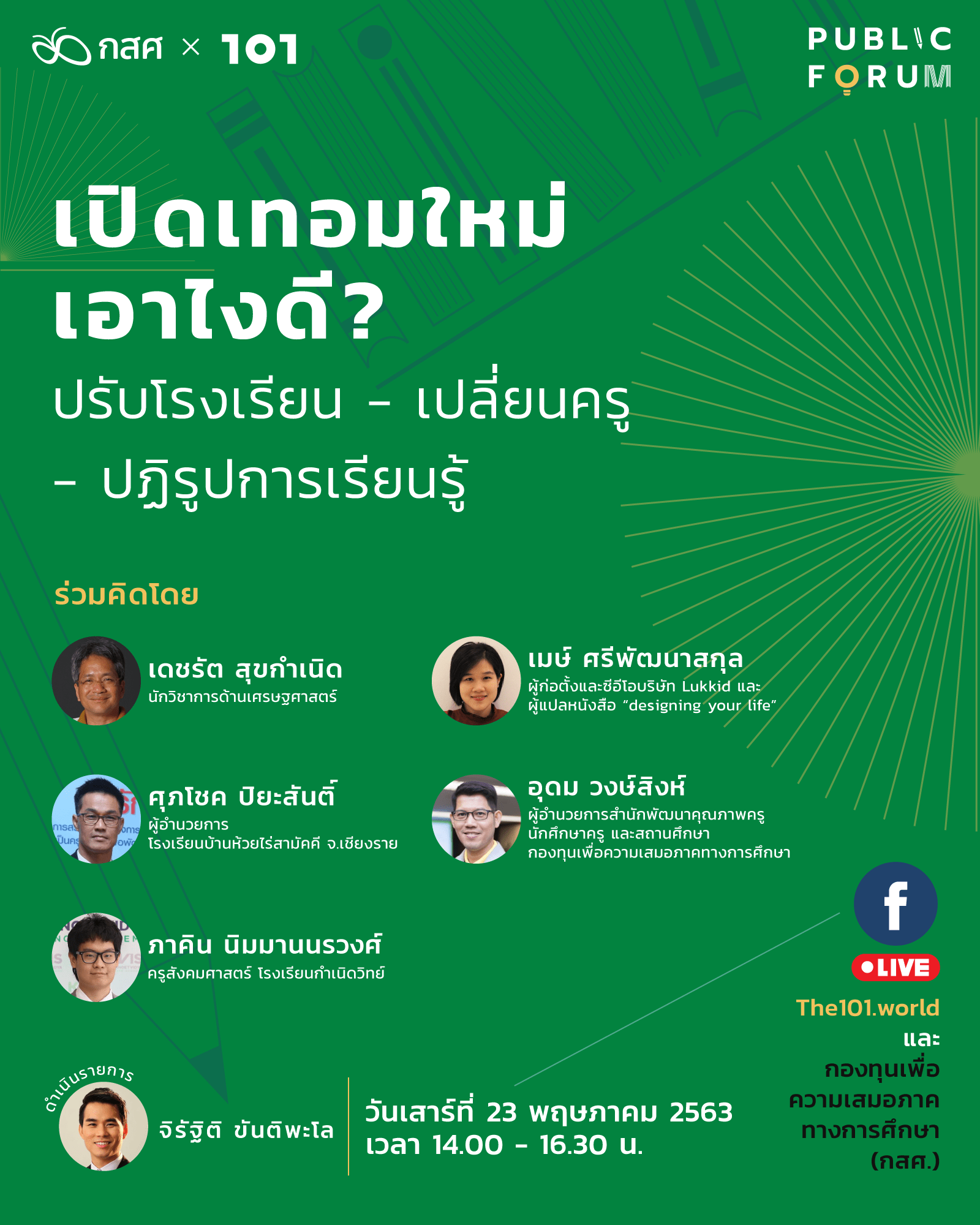 ร่วมคิดพร้อมกัน วันเสาร์ที่ 23 พฤษภาคม 2563 เวลา 14.00-16.30 น. ทางเพจ the101.world และ กองทุนเพื่อความเสมอภาคทางการศึกษา (กสศ.)