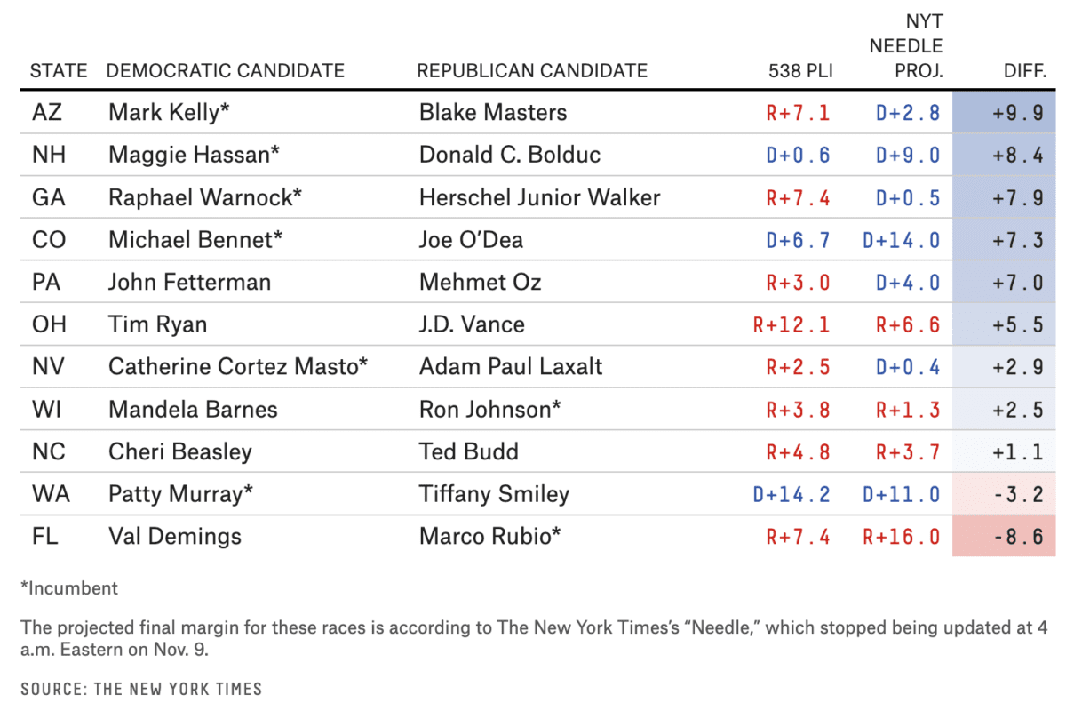 538 สื่อที่วิเคราะห์สถิติผลการเลือกตั้ง นำดีชนีบ่งชี้แนวโน้มสนับสนุนพรรค (partisan-lean indicator) ของแต่ละรัฐว่ามีแนวโน้มจะสนับสนุนพรรคใด มาเปรียบเทียบกับการประเมินผลการเลือกตั้งวุฒิสมาชิกในสนามสำคัญ พบว่าผู้สมัครจากเดโมแครตส่วนใหญ่ทำผลงานได้ดีกว่าดัชนีมาก ในแอริโซนาและนิวแฮมเชียร์ เดโมแครตสามารถรักษาเก้าอี้ไว้สำเร็จ โดยได้คะแนนเสียงมากกว่าดัชนีถึงเกือบ 10 เปอร์เซ็นต์ หรือแม้กระทั่งในรัฐที่เดโมแครตแพ้รีพับลิกัน ช่องว่างกลับไม่ห่างเท่ากับแนวโน้มของรัฐ โดยมีเพียงไวโอมิงและฟลอริดาเท่านั้นที่เป็นข้อยกเว้น ตารางที่ 2 ยิ่งบ่งชี้ให้เห็นว่าการเลือกตั้งมิดเทอม 2022 สำหรับรีพับลิกันน่าผิดหวังเพียงใด