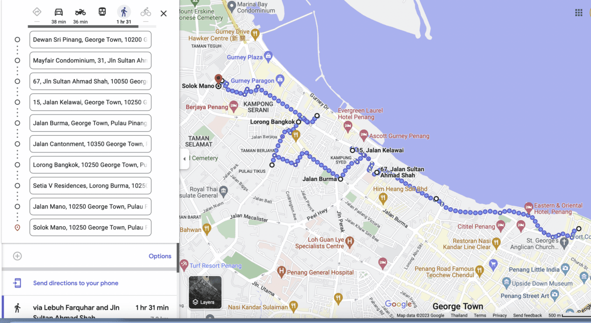 เมื่อดู Google Map จะเห็นได้ว่าผู้เขียนปักหมุดไว้สิบจุดด้วยกัน บางจุดเป็นชื่ออาคารในปัจจุบันซึ่งเคยเป็นที่ตั้งของบ้านพักเหล่านั้นมาก่อน บางจุดเป็นเพียงชื่อถนน (Jalan/Jln) เลน (Lorong) และซอยแยก (Solok) ที่เคยมีบ้านพักตั้งอยู่ ทั้งสิบจุดวางตัวอยู่ในแนวเลียบชายฝั่ง ใช้ระยะเวลาเดินเท้าประมาณหนึ่งชั่วโมงครึ่ง หรือขับรถราว 38 นาทีเท่านั้น ผู้เขียนตั้งต้นที่ Dewan Sri Pinang หอศิลป์และโรงละครใกล้ศาลาว่าการเมืองปีนัง ซึ่งแต่เดิมคือ ‘บ้านระนอง’ (ตระกูล ณ ระนอง บริจาคที่ดินให้ทางการเมืองปีนัง) ไปจนสุดที่ Solok Mano อันเป็นบริเวณที่เคยเป็นที่ตั้งของบ้านพระยามโนปกรณ์นิติธาดา ชื่อ Jalan Mano และ Solok Mano ตั้งขึ้นเพื่อเป็นที่ระลึกถึงเรื่องราวดังกล่าว