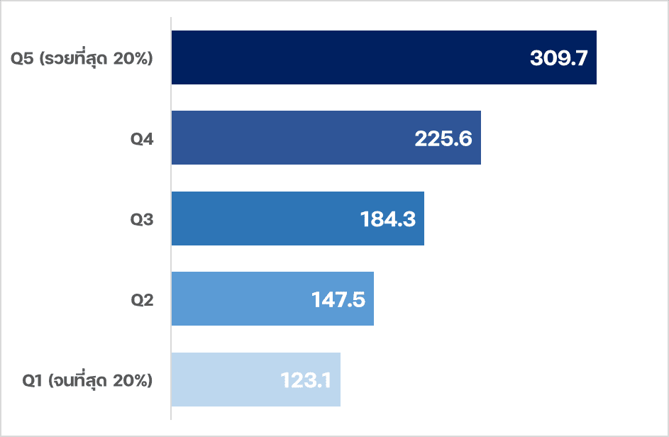 101 PUB เปรียบเทียบปริมาณการใช้ไฟฟ้าแต่ละครัวเรือน[2] โดยแบ่งครัวเรือนออกเป็น 5 กลุ่มเรียงลำดับจากจนที่สุด 20% หรือควินไทล์ 1 ไปรวยที่สุด 20% หรือควินไทล์ 5 ตามระดับรายได้ต่อหัวของสมาชิกครัวเรือน พบว่าครัวเรือนรวยที่สุด 20% มีปริมาณการใช้ไฟฟ้าเฉลี่ยต่อครัวเรือน 309.7 หน่วยซึ่งมากที่สุดเมื่อเทียบกับกลุ่มรายได้อื่นๆ คิดเป็นเกือบ 3 เท่าของปริมาณการใช้งานของครัวเรือนในกลุ่มควินไทล์ 1 (ภาพที่ 2)