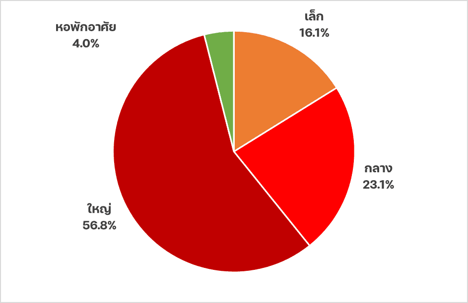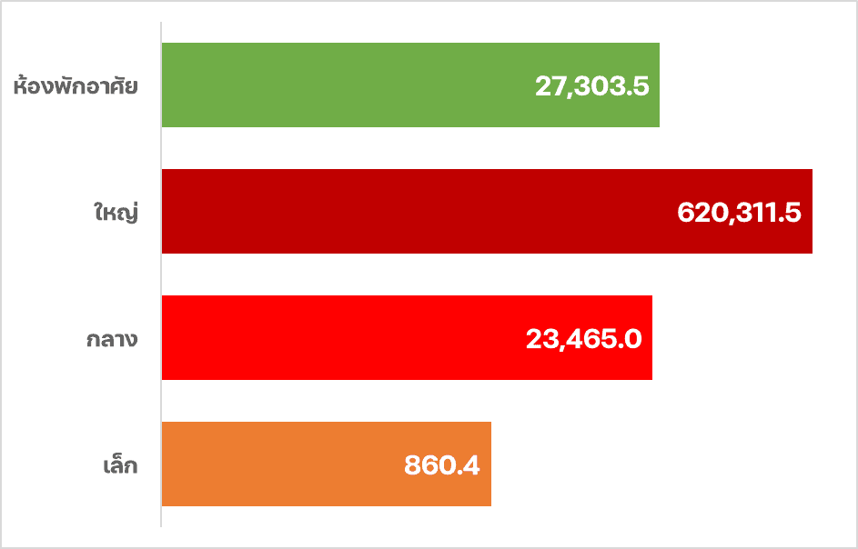 สำหรับผู้ใช้ไฟฟ้าประเภทกิจการ เมื่อพิจารณาสัดส่วนของกิจการแต่ละขนาดตามปริมาณการใช้ไฟฟ้า ดังที่สำนักนโยบายและแผนพลังงานจำแนก จะพบว่า 93.9% เป็นกิจการขนาดเล็ก ขณะที่กิจการขนาดกลาง ขนาดใหญ่ และห้องพักอาศัย มีสัดส่วน 4.9%, 0.46%, และ 0.73% ตามลำดับ (ตารางที่ 1) อย่างไรก็ดี เมื่อคำนวณปริมาณการใช้ไฟฟ้าแล้ว กิจการขนาดใหญ่ใช้ไฟฟ้ารายกิจการเฉลี่ยสูงกว่ากิจการอื่นๆ หลายเท่า[3] (ภาพที่ 4)