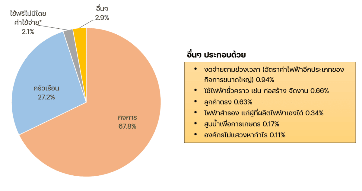 ปัจจุบันผู้ใช้ไฟฟ้าประเภทกิจการบริโภคไฟฟ้ามากที่สุด คิดเป็น 67.8% ของการใช้ไฟฟ้าของประเทศไทย รองลงมาคือผู้ใช้ประเภทครัวเรือนที่มีสัดส่วนของการใช้งาน 27.2% สำนักนโยบายและแผนพลังงานยังจำแนกปริมาณการใช้ไฟฟ้าย่อยลงไป ทำให้เห็นว่านโยบายที่ให้ใช้ไฟฟ้าฟรีสำหรับครัวเรือนที่ใช้ไฟฟ้าไม่เกิน 50 หน่วย/เดือนติดต่อกัน 3 เดือนมีสัดส่วนอีก 2.1% และในส่วนที่เหลือคือกลุ่มผู้ใช้ไฟฟ้าย่อยๆ ที่มีสัดส่วนการใช้ไฟฟ้าลดหลั่นกันตามลำดับ กล่าวคือ ไฟฟ้าที่งดจ่ายได้ตามช่วงเวลา 0.94%, ผู้ใช้ไฟฟ้าชั่วคราว 0.66%, ลูกค้าตรง ลูกค้าโดยตรง 0.63%, ไฟฟ้าสำรองสำหรับผู้ที่สามารถผลิตไฟฟ้าเองได้ 0.34%, สูบน้ำเพื่อการเกษตร 0.17%, และองค์กรไม่แสวงหากำไร 0.11% (ภาพที่ 1)