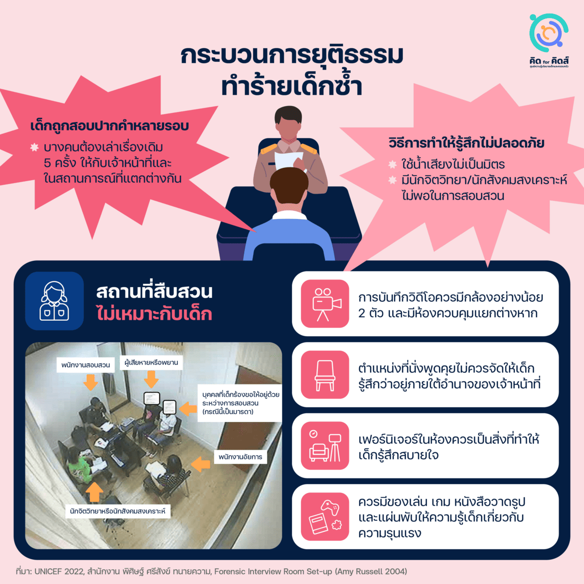 - การสอบปากคำและสืบพยานหลักฐานจากเด็กไม่ควรมีเกิน 2 ครั้ง