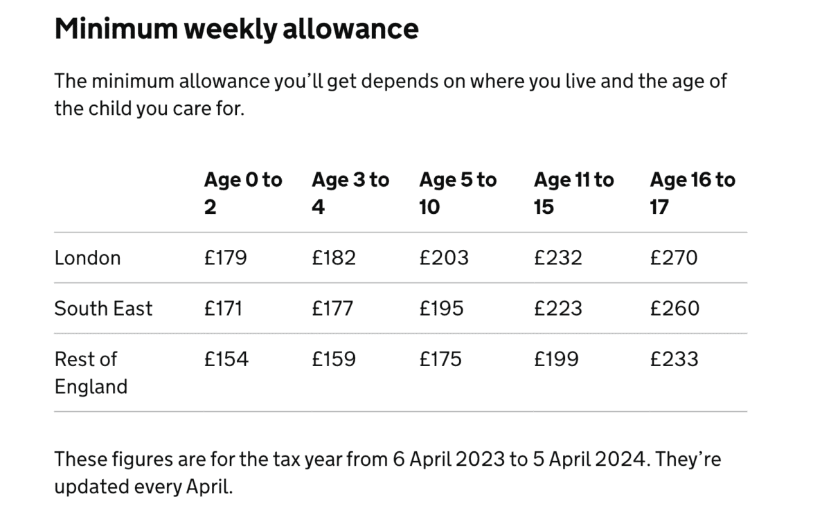 หลักเกณฑ์การให้เงินช่วยเหลือในประเทศอังกฤษ มีการให้เป็นรายอาทิตย์ โดยต่ำสุดอยู่ที่ 154 ปอนด์/อาทิตย์ และสูงสุดอยู่ที่ 270 ปอนด์/อาทิตย์ โดยมีการกำหนดเงินที่จะช่วยเหลือตามอายุของเด็ก ที่สะท้อนค่าครองชีพในการเลี้ยงดูเด็กที่แตกต่างไปในแต่ละช่วงวัย ความต้องการพิเศษของเด็ก ลักษณะและทักษะประสบการณ์ของครอบครัวอุปถัมภ์ที่เด็กอยู่ นอกจากนี้ยังมีการกำหนดเงินช่วยเหลือตามพื้นที่ที่เด็กอยู่อาศัย เพื่อปรับเงินช่วยเหลือให้สอดคล้องกับค่าครองชีพในพื้นที่นั้นๆ ด้วย[26] ดังภาพ