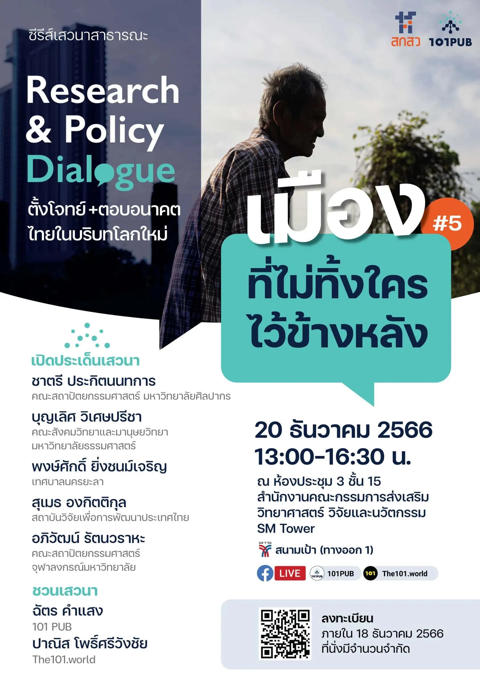 ชวนล้อมวงถก ร่วมกัน ‘ตั้ง’ โจทย์วิจัย เพื่อ ‘ตอบ’ อนาคตนโยบายการพัฒนาเมืองที่ไม่ทิ้งใครไว้ข้างหลัง กระจายโอกาสทางเศรษฐกิจและสังคมอย่างทั่วถึง โอบรับความหลากหลาย มีทิศทางการพัฒนาที่เหมาะสมกับบริบทและภูมินิเวศอย่างยั่งยืนในทุกมิติ ในซีรีส์เสวนาสาธารณะ Research and Policy Dialogue : ‘ตั้งโจทย์+ตอบอนาคต ประเทศไทยในบริบทโลกใหม่’ ครั้งที่ 5