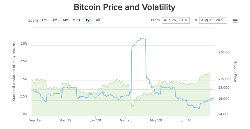 หากใช้ส่วนเบี่ยงเบนมาตรฐานของอัตราผลตอบแทนรายวันเป็นตัวชี้วัดความเสี่ยงหรือความแปรปรวนในผลตอบแทน เราจะพบว่าในบางช่วงเวลานั้นผลตอบแทนของเงินคริปโตสามารถเหวี่ยงได้รุนแรง จะสามารถสร้างผลกำไรหรือขาดทุนได้มากมหาศาลเช่นกัน รูปภาพที่ 3 ด้านล่างแสดงให้เห็นความผันผวนของผลตอบแทนและราคาบิตคอยน์ในช่วงหนึ่งปีที่ผ่านมา ซึ่งความผันผวนที่ปรากฏในช่วงเดือนมีนาคม-พฤษภาคมปีนี้มีค่าใกล้เคียงร้อยละ 10 เลยทีเดียว