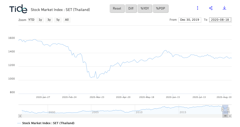ดัชนีราคาตลาดหลักทรัพย์แห่งประเทศไทย เมื่อวันที่ 2 มกราคม อยู่ที่ระดับ 1,595.82 เมื่อเทียบกับดัชนีราคา ณ วันที่ 17 สิงหาคมที่ผ่านมา ดัชนีราคาตกมาอยู่ที่ระดับ 1,320.91 จุด (ดูรูปที่ 2 ประกอบ) นั่นหมายความว่า หากเราลงทุนในดัชนีราคานี้ตอนต้นปี เราจะประสบกับการขาดทุนในอัตราร้อยละ 17.2 กล่าวอีกนัยหนึ่งคือเงิน 100 บาทที่เราลงทุนไว้ในตลาดหุ้นไทยในตอนต้นปี จะเหลือเพียง 82.8 บาทเท่านั้น