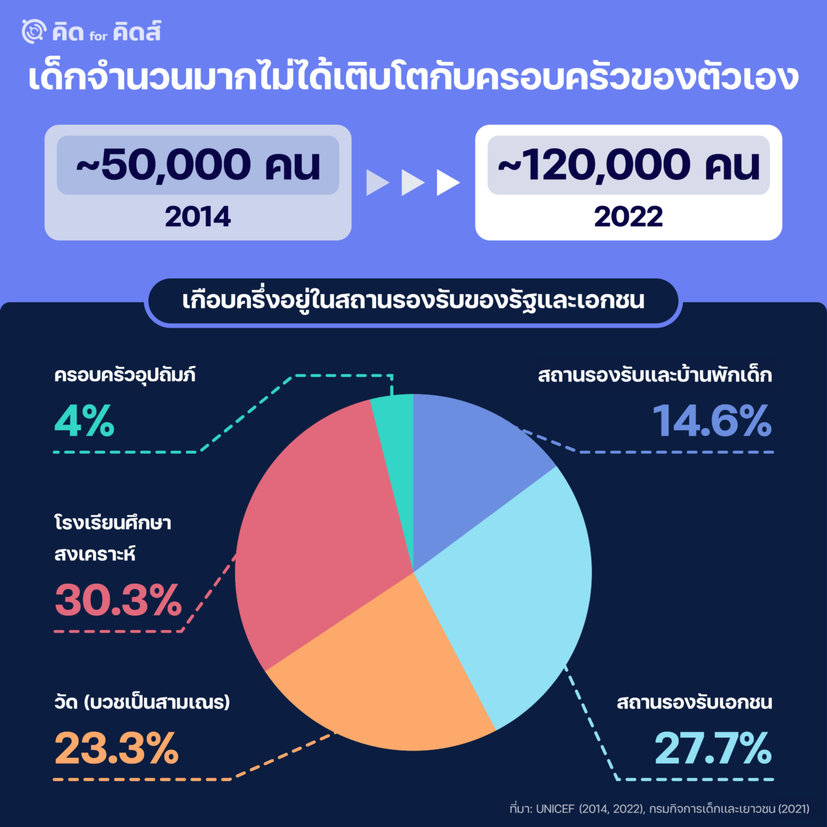 เด็กไทยมีแนวโน้มต้องเติบโตนอกครอบครัวของตัวเองมากขึ้น UNICEF สำรวจจำนวนเด็กที่ต้องแยกจากครอบครัวพบว่าในปี 2014 มีเด็กไทยที่ออกไปเติบโตนอกบ้านของตัวเองราว 50,000 คน[2] ในขณะที่ปี 2022 มีเด็กไทยที่เติบโตนอกบ้านของตัวเองอย่างน้อย 120,000 คน โดยเด็กอยู่ในสถานรองรับและบ้านพักเด็กของรัฐ 20,800 คน (หรือคิดเป็น 12.8%) อยู่ในสถานรองรับเอกชนอย่างน้อย 39,382 คน (หรือคิดเป็น 27.7%) อยู่ในโรงเรียนศึกษาสงเคราะห์ 43,030 คน (หรือคิดเป็น 26.4%) บวชเป็นสามเณร 33,150 คน (หรือคิดเป็น 20.4%)[3] และสุดท้ายอยู่ในครอบครัวอุปถัมภ์ทั้งที่เป็นญาติของเด็กและไม่ใช่ญาติในข้อมูลอย่างเป็นทางการของรัฐ 5,632 คน (หรือคิดเป็น 3.5%)[4]