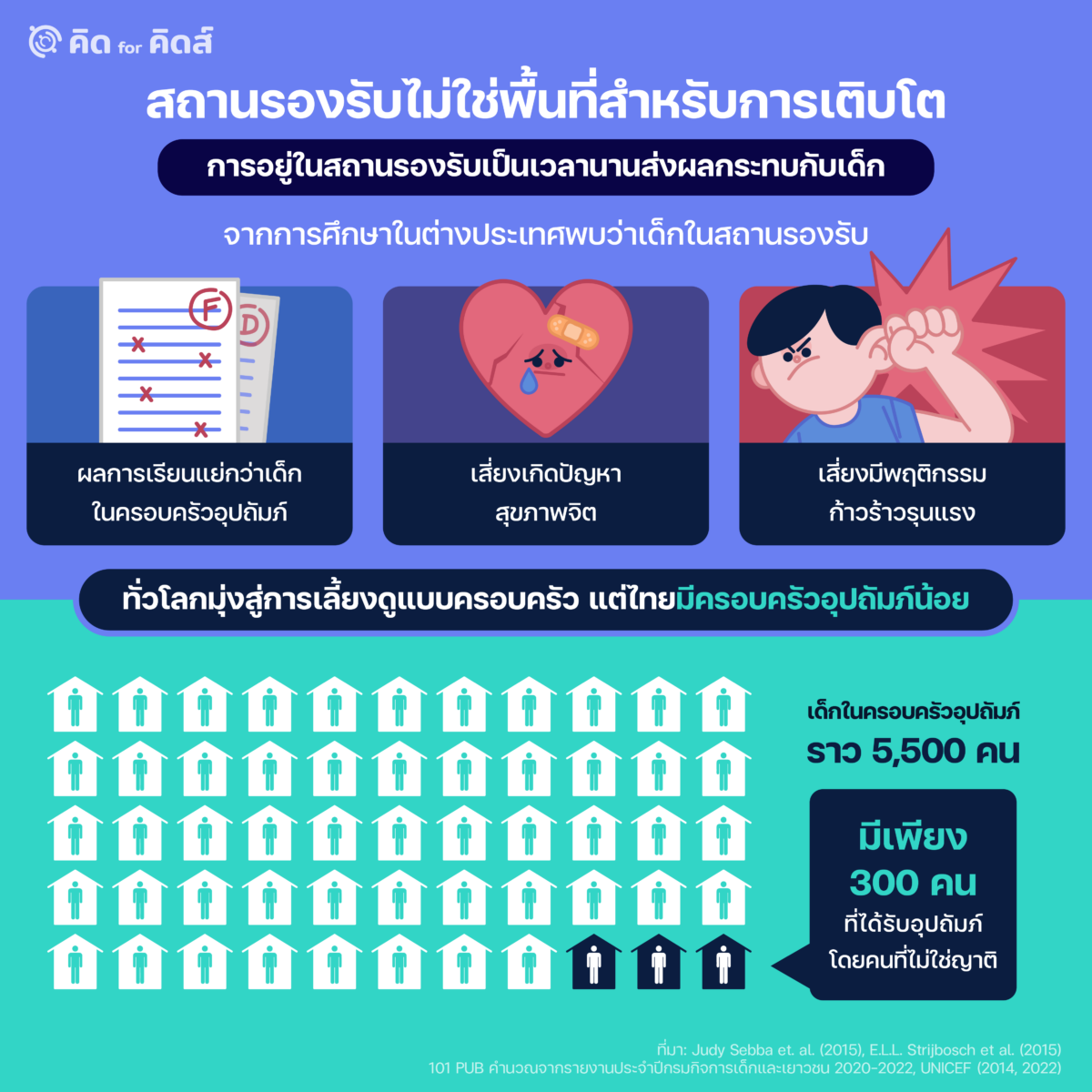 จะเห็นได้ว่า เด็กไทยกว่าครึ่งที่ไม่ได้เติบโตในบ้านของตัวเอง ต้องเติบโตในสถานรองรับ[5] ซึ่งมักจะต้องดูแลเด็กจำนวนมากที่อยู่ร่วมกัน จนสุ่มเสี่ยงที่เด็กแต่ละคนจะไม่ได้รับการดูแลเอาใจใส่อย่างใกล้ชิด ในต่างประเทศมีการศึกษาเปรียบเทียบผลกระทบทั้งระยะสั้นและยาวของการเติบโตในสถานรองรับอย่างเป็นระบบ และพบว่าทำให้เกิดผลกระทบต่อเด็กทั้งทางด้านสุขภาพกาย สุขภาพจิต รวมถึงพัฒนาการของเด็ก