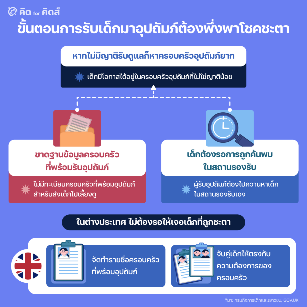 นั่นหมายความว่าวิธีการที่ไทยทำจึงกลับหัวกลับหาง ขาดฐานข้อมูลครอบครัวที่พร้อมอุปถัมภ์เด็กจากรัฐ เมื่อเกิดกรณีที่เด็กต้องออกจากครอบครัวแล้วไม่มีญาติที่พร้อมช่วยเหลือเลี้ยงดู จึงมักจะถูกส่งไปยังสถานรองรับ ซึ่งหากโชคดี ก็จะมีผู้ที่พร้อมอุปถัมภ์และถูกชะตากับเด็กมาอุปถัมภ์เด็กต่อไป จนทำให้ไทยมีครอบครัวอุปถัมภ์โดยเฉพาะแบบที่ไม่ใช่เครือญาติจำนวนน้อย