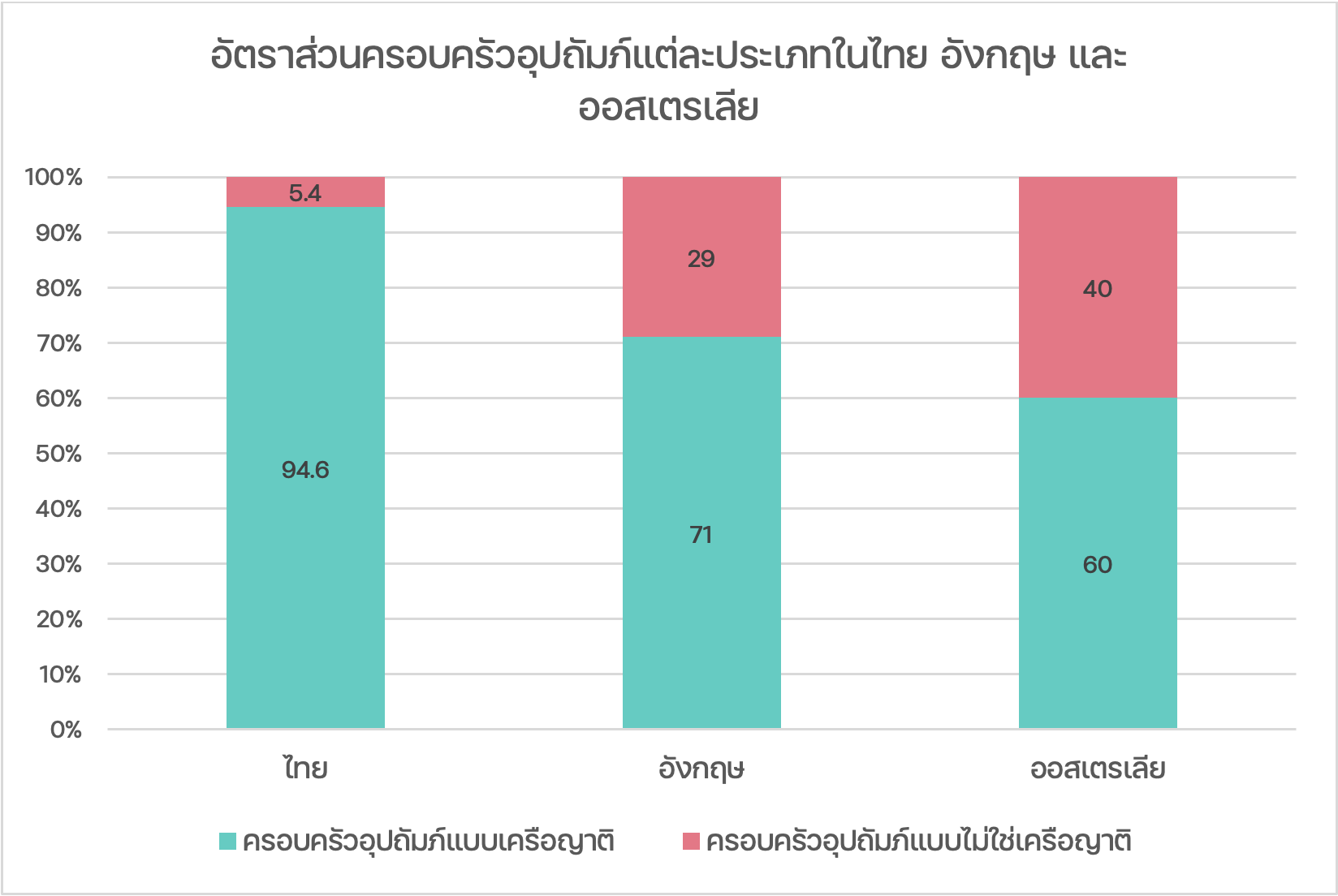 อย่างไรก็ดี 3 ปีที่ผ่านมา ไทยมีจำนวนครอบครัวอุปถัมภ์ทั้งแบบเครือญาติและไม่ใช่เครือญาติเฉลี่ยอยู่ที่ 5,583 ครอบครัวหรือคิดเป็น 4% จากเด็กที่ต้องเติบโตนอกครอบครัวของตัวเองทั้งหมด และจากการรายงานของ UNICEF พบว่าครอบครัวอุปถัมภ์เพียง 300 ครอบครัวหรือ 5.4% ของครอบครัวอุปถัมภ์ทั้งหมดเป็นครอบครัวอุปถัมภ์ที่ไม่ใช่เครือญาติ และอีกกว่า 94.6% ในประเทศไทยเป็นครอบครัวอุปถัมภ์แบบเครือญาติ