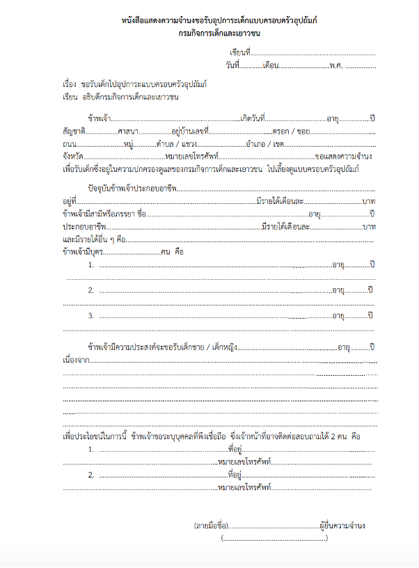 จากนั้นผู้ที่ต้องการอุปถัมภ์เด็กต้องแสดงความจำนงขอรับเด็กคนนั้นไปอุปถัมภ์ หนังสือแสดงความจำนงขอรับอุปการะเด็กแบบครอบครัวอุปถัมภ์แสดงให้เห็นว่าผู้ที่ต้องการรับเด็กไปอุปถัมภ์ต้องรู้ว่าเด็กคนนั้นเป็นใคร ชื่ออะไร มีเพศสภาพแบบใด ดังภาพ หลังจากนั้นเจ้าหน้าที่ที่เกี่ยวข้องจะดำเนินการตรวจสอบ เยี่ยมบ้านและขออนุมัติการเป็นครอบครัวอุปถัมภ์ทั้งแบบรับเงินสนับสนุนและไม่รับเงินสนับสนุนต่อไป[18]